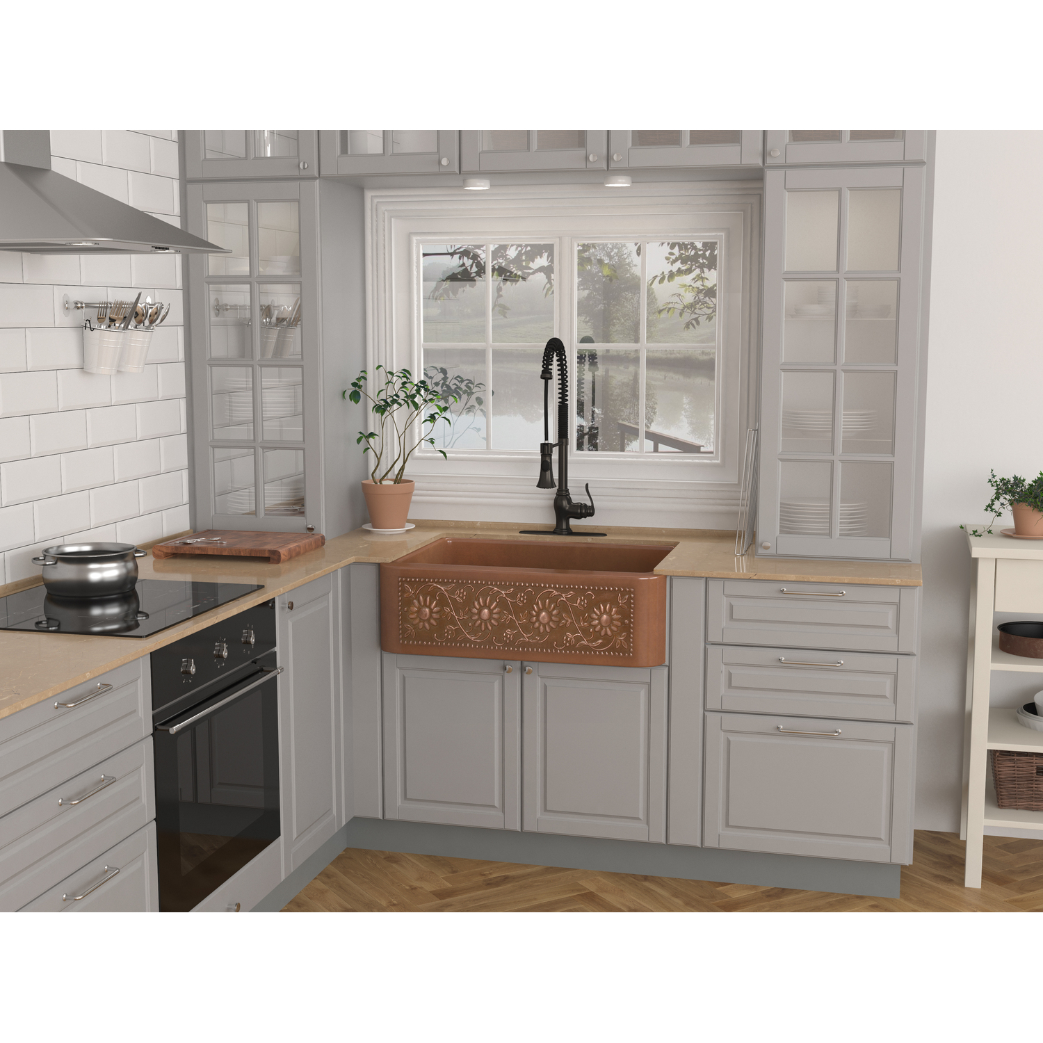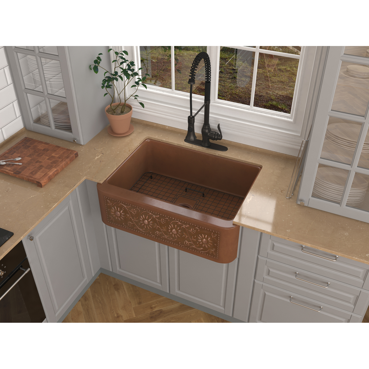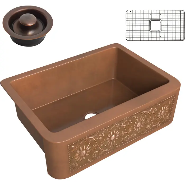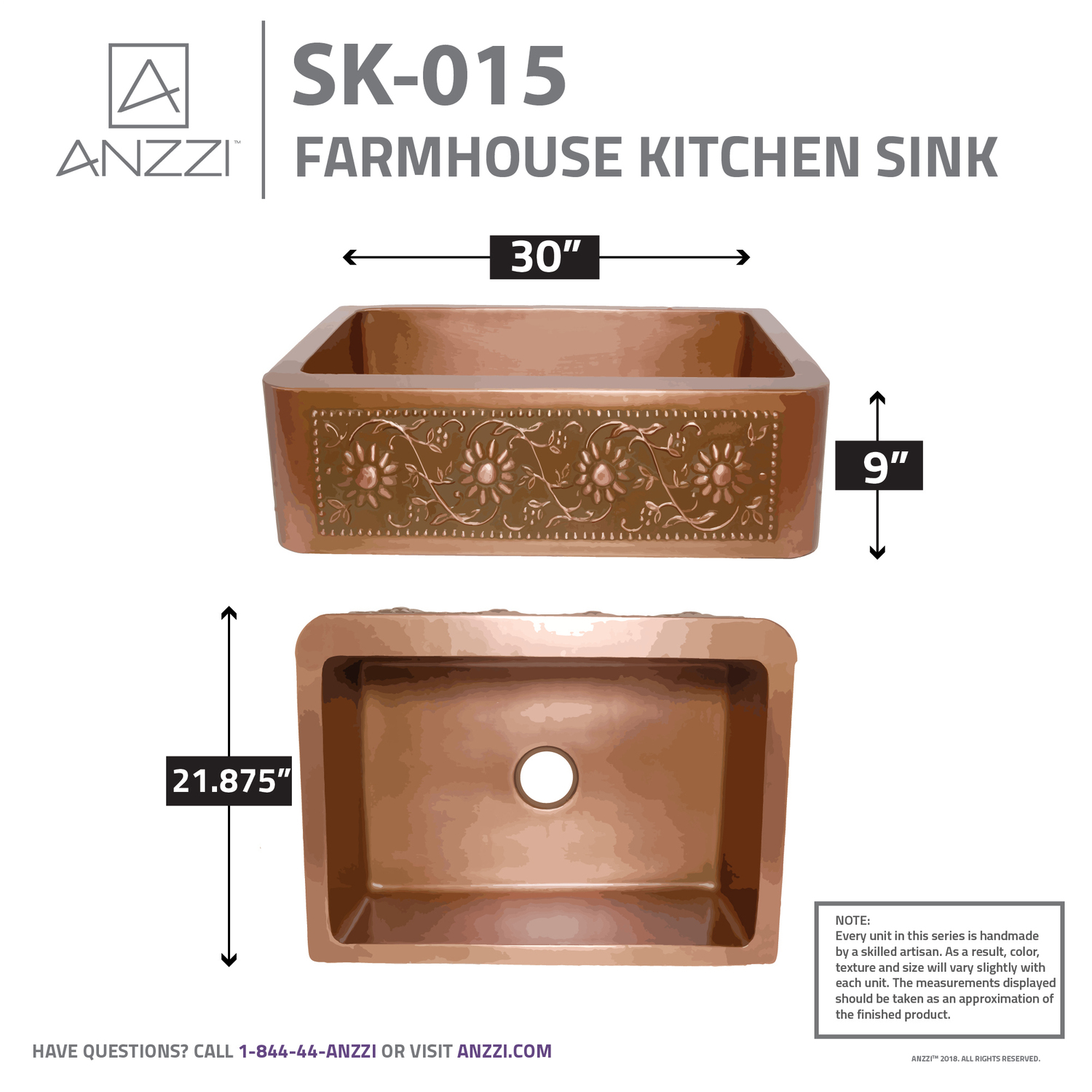 Anzzi Cilicia Farmhouse Handmade Copper 30 in. 0-Hole Single Bowl Kitchen Sink with Daisy Design Panel in Polished Antique Copper, 191042047198, SK-015