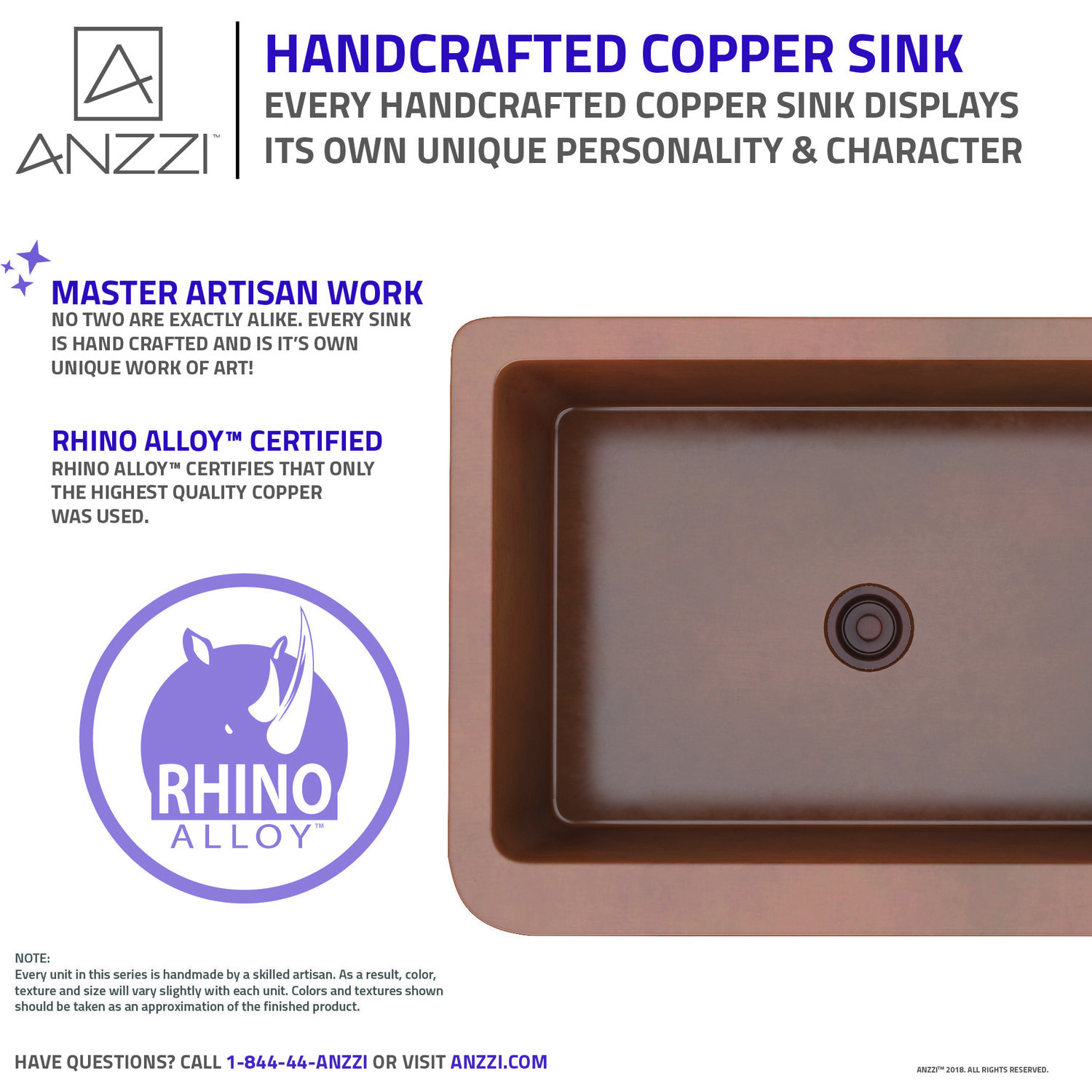 ANZZI presents the latest trending in modern antique Cilicia series farmhouse kitchen sink. All ANZZI Cilicia kitchen sinks are handcrafted using only Rhino Alloy certified artisan copper. This gorgeous farmhouse sink will transform your kitchen into an expression of yourself on par with the finest of culinary arts. Become a member of the ANZZI family and experience why Perfection is our Tradition.Single bowl kitchen sinkShips within 24 hours of order processingEvery piece is fully handmade from start to finishCrafted using RHINO ALLOY certified copperLimited lifetime warranty from manufacturer defectsHandmade process will result in subtle variations in color, shape and finishMatching stopper and basin grid includedOne piece constructionTo speak to a knowledgeable and dedicated ANZZI specialist simply call 1-844-44-ANZZI or visit us on the web at www.ANZZI.com