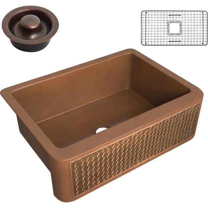 Anzzi Edessa Farmhouse Handmade Copper 30 in. 0-Hole Single Bowl Kitchen Sink with Weave Design Panel in Polished Antique Copper, 191042047204, SK-016