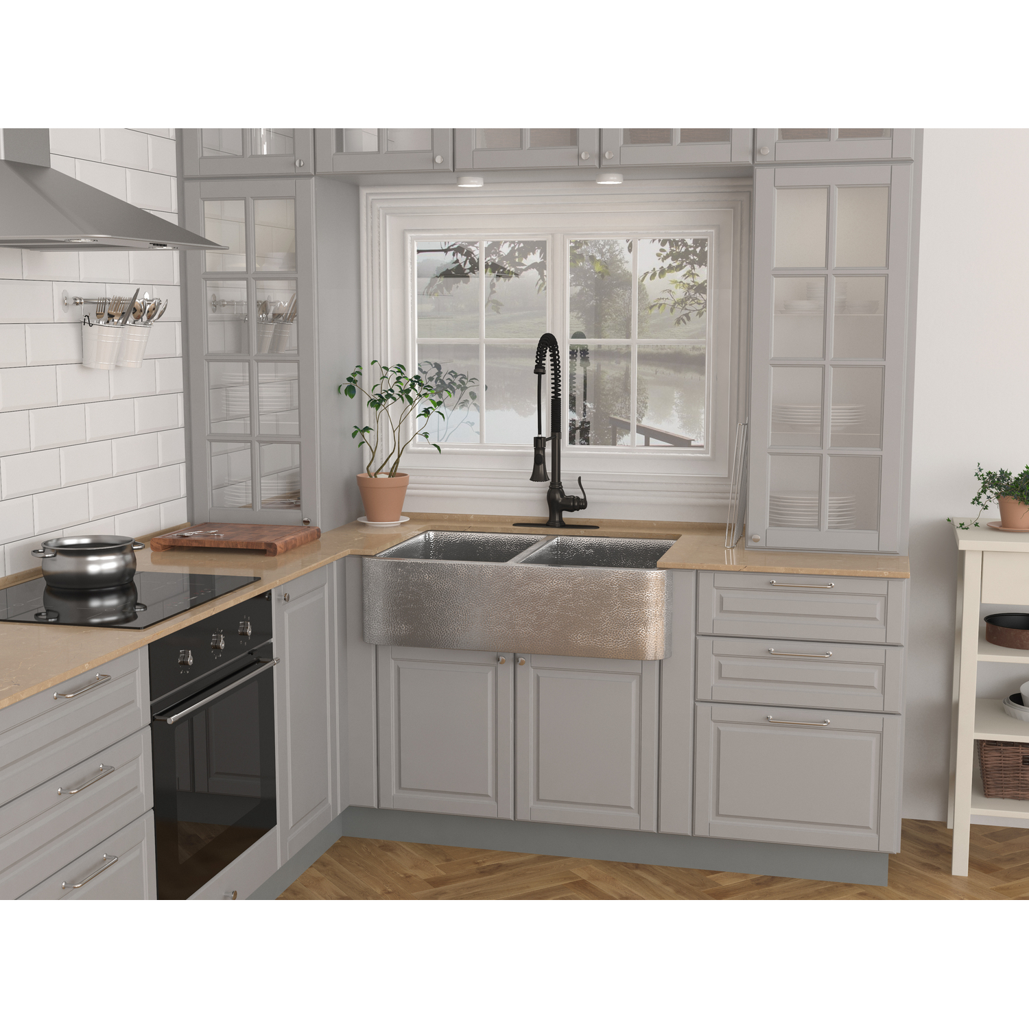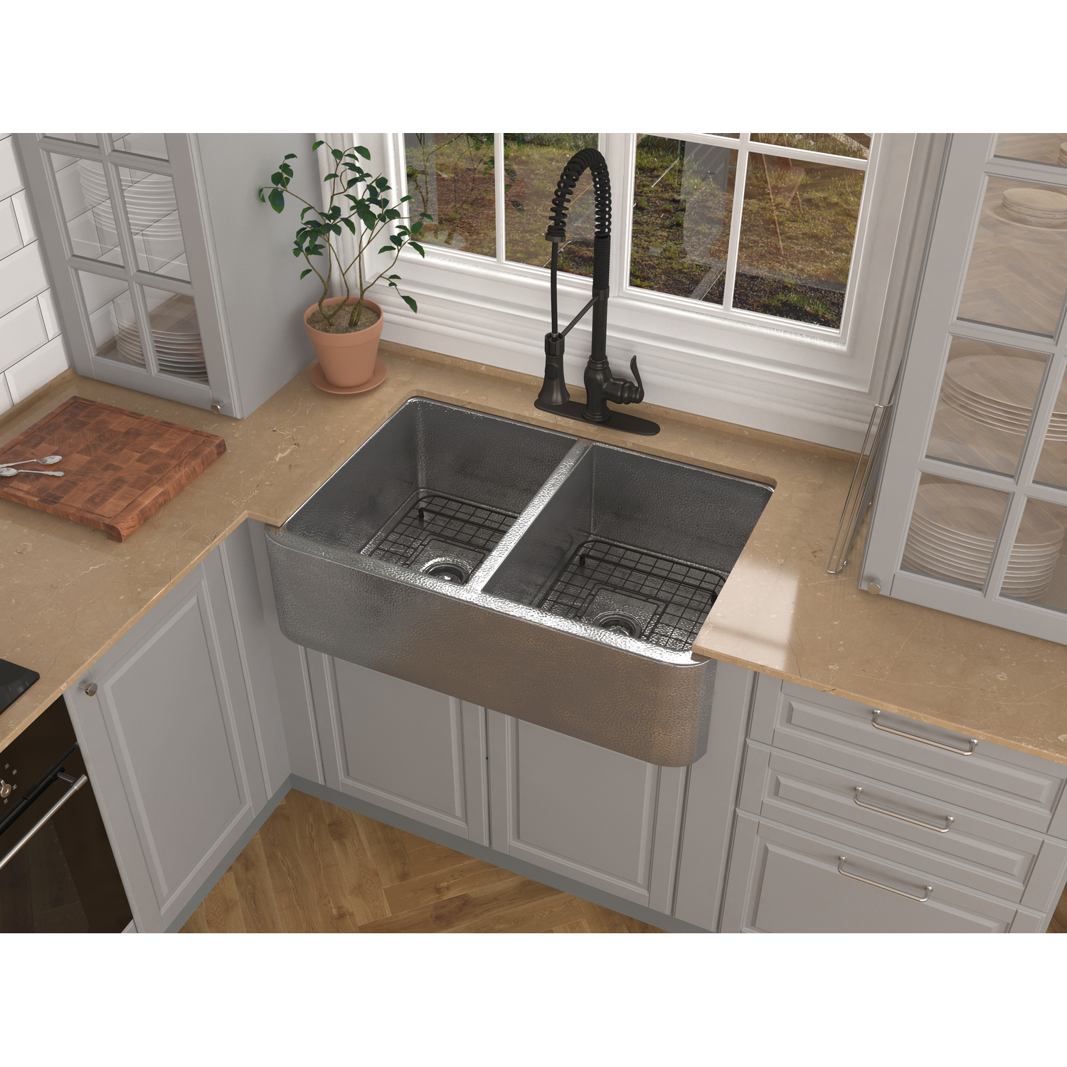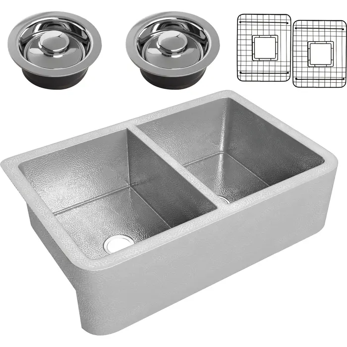 Anzzi Bengal Farmhouse Handmade Copper 33 in. 50/50 Double Bowl Kitchen Sink in Hammered Nickel, 191042047242, SK-022