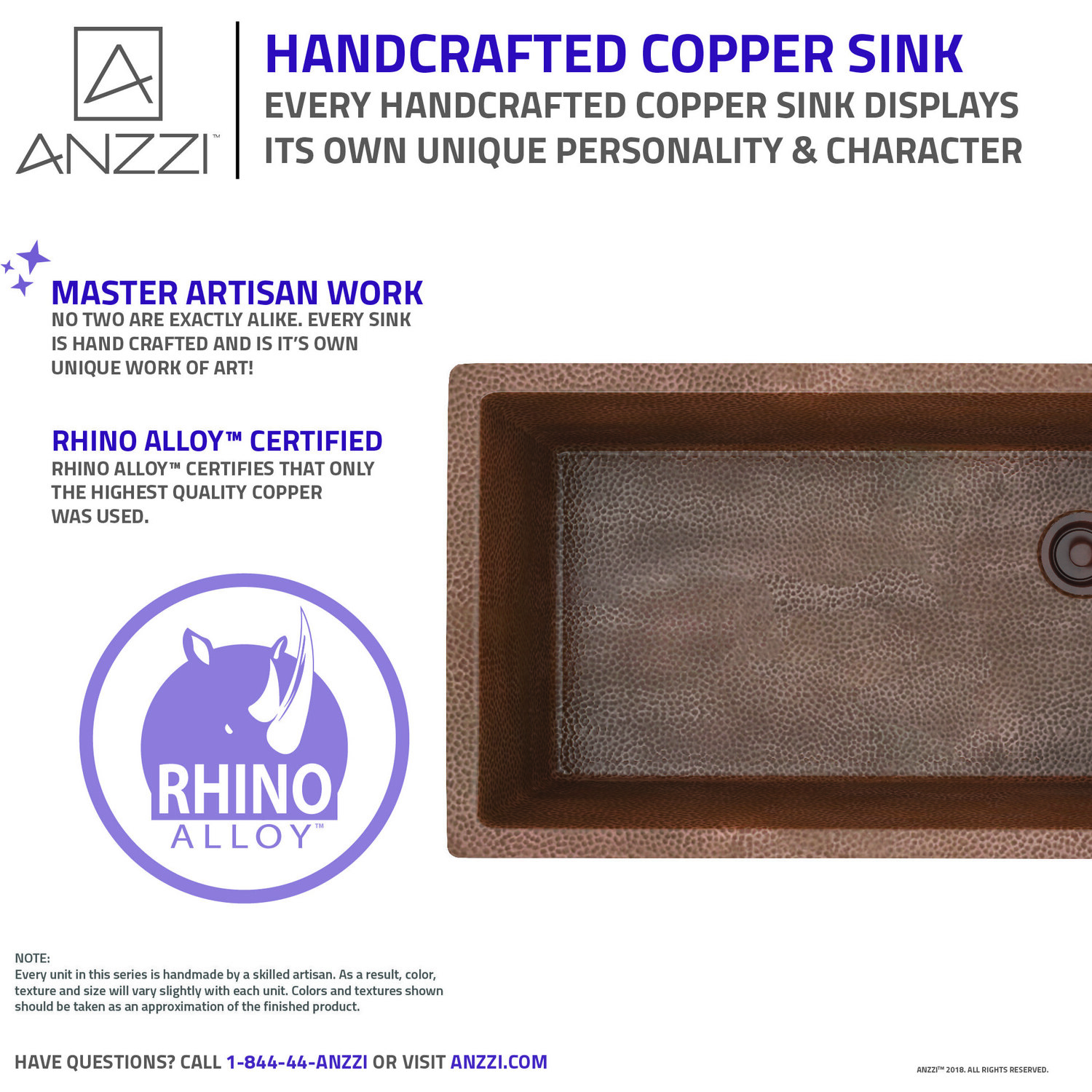 ANZZI presents the latest trending in modern antique Byzantine series drop-in kitchen sink. All ANZZI Byzantine kitchen sinks are handcrafted using only Rhino Alloy certified artisan copper. This drop-in sink is perfect center piece for your kitchen. Become a member of the ANZZI family and experience why Perfection is our Tradition.Single bowl kitchen sinkShips within 24 hours of order processingEvery piece is fully handmade from start to finishCrafted using RHINO ALLOY certified copperLimited lifetime warranty from manufacturer defectsHandmade process will result in subtle variations in color, shape and finishMatching stopper and basin grid includedOne piece constructionTo speak to a knowledgeable and dedicated ANZZI specialist simply call 1-844-44-ANZZI or visit us on the web at www.ANZZI.com