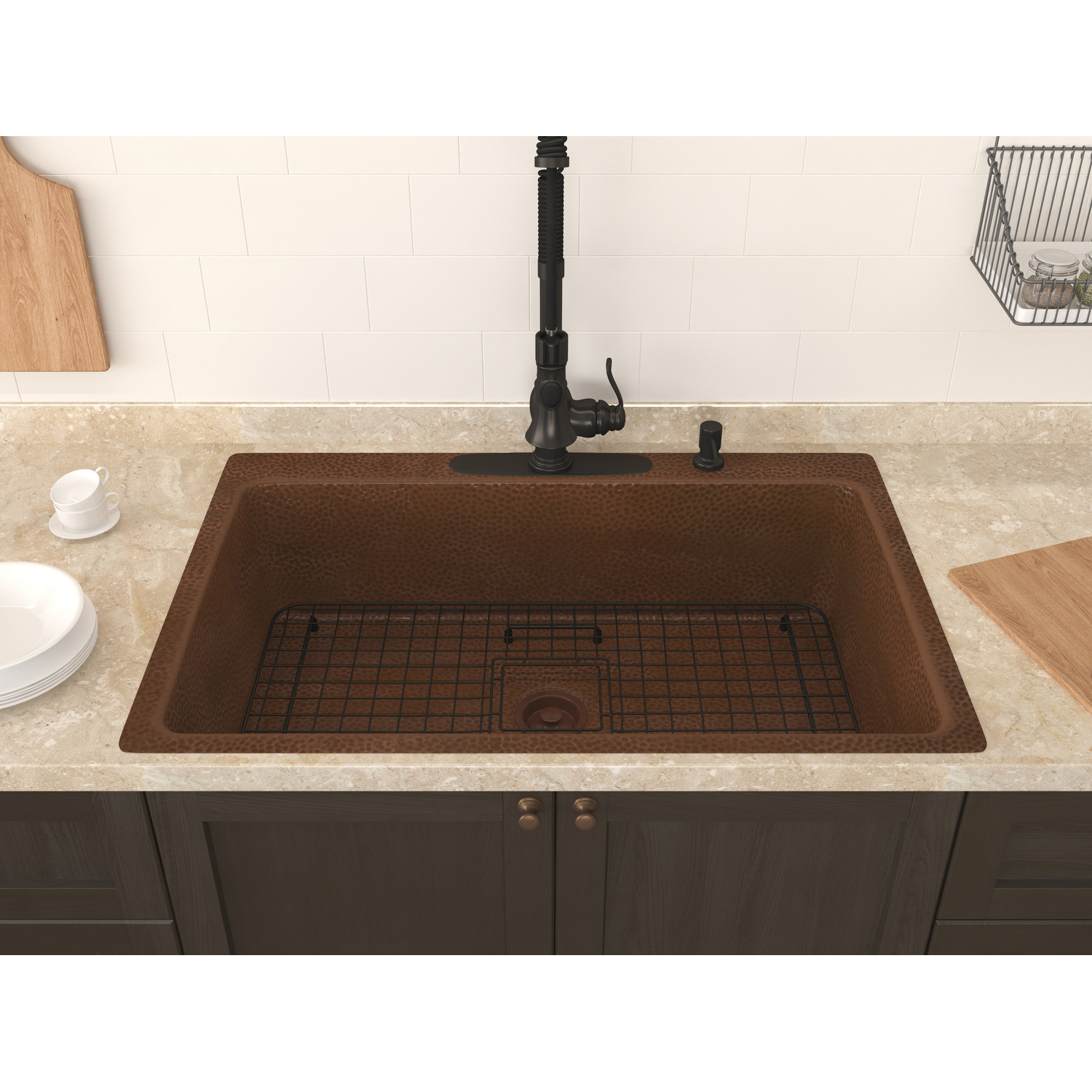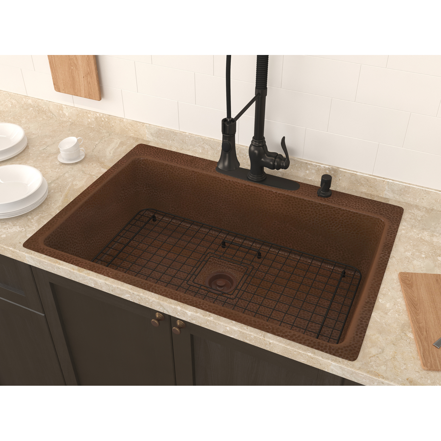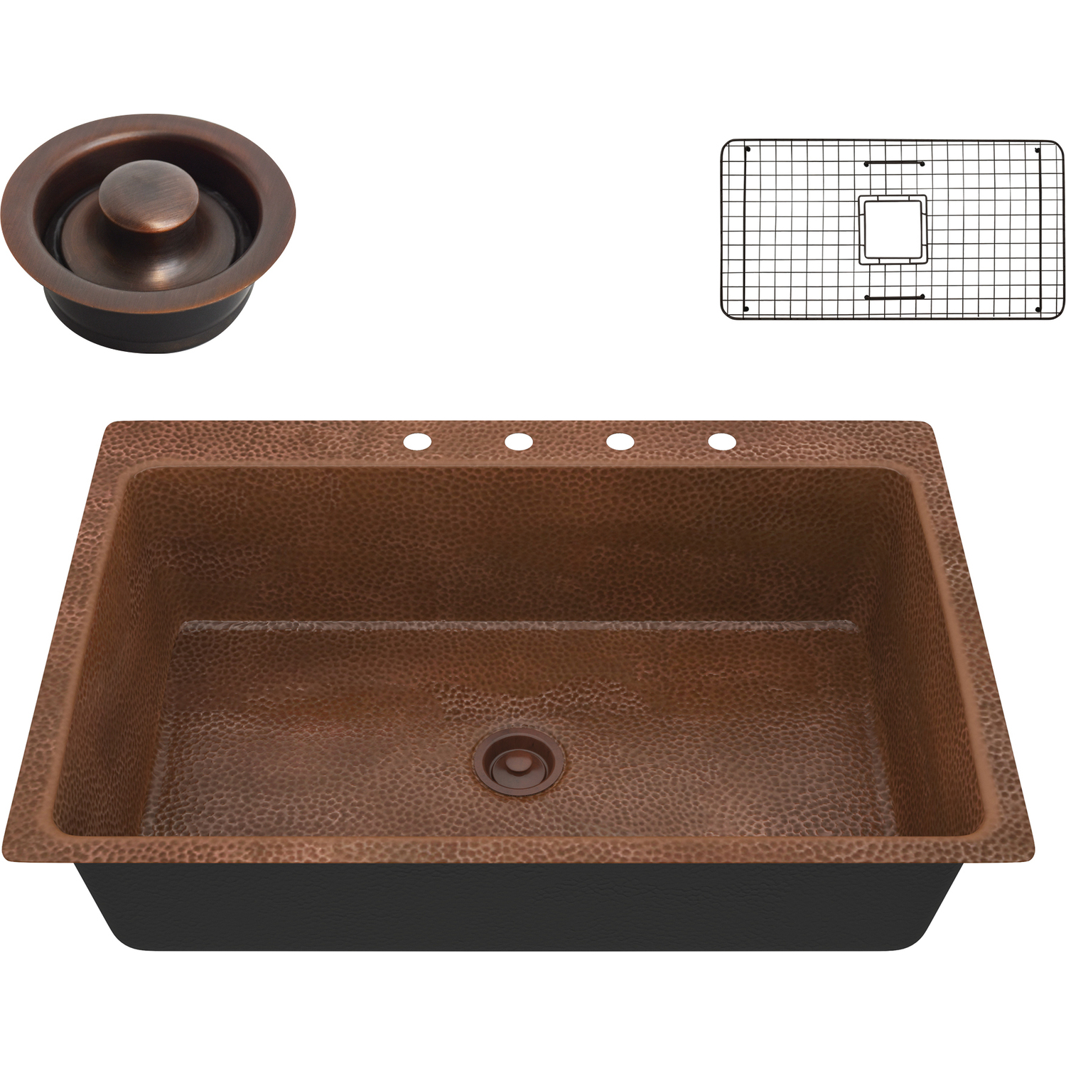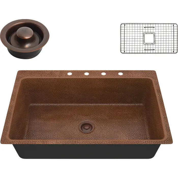 Anzzi Lydia Drop-in Handmade Copper 33 in. 4-Hole Single Bowl Kitchen Sink in Hammered Antique Copper, 191042047297, SK-028
