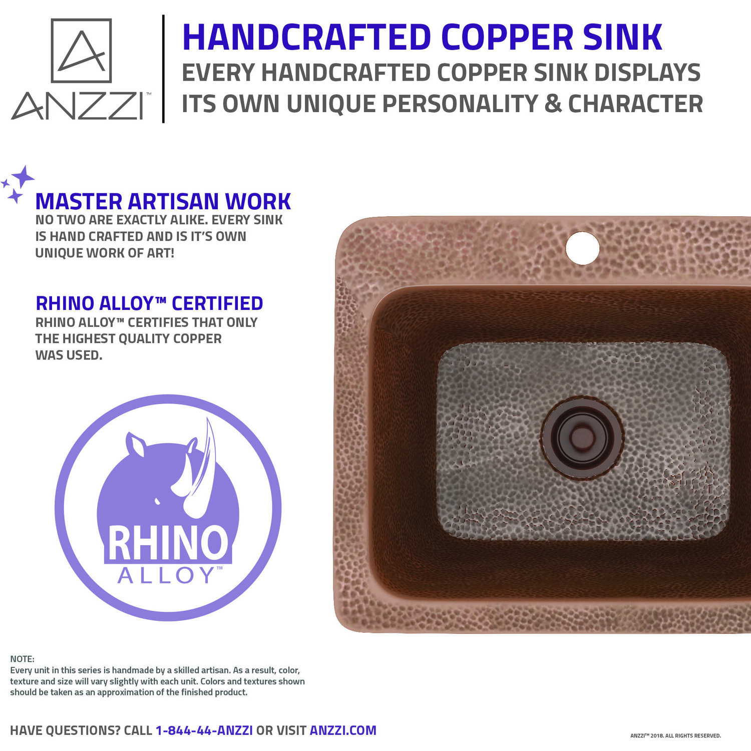 ANZZI presents the latest trending in modern antique Manisa series drop-in kitchen sink. All ANZZI Manisa kitchen sinks are handcrafted using only Rhino Alloy certified artisan copper. This drop-in sink is perfect center piece for your kitchen. Become a member of the ANZZI family and experience why Perfection is our Tradition.Single bowl kitchen sinkShips within 24 hours of order processingEvery piece is fully handmade from start to finishCrafted using RHINO ALLOY certified copperLimited lifetime warranty from manufacturer defectsHandmade process will result in subtle variations in color, shape and finishMatching stopper and basin grid includedOne piece constructionTo speak to a knowledgeable and dedicated ANZZI specialist simply call 1-844-44-ANZZI or visit us on the web at www.ANZZI.com
