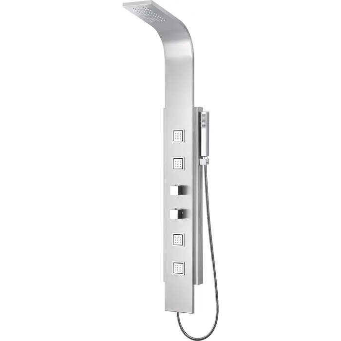 ANZZI is introducing the next level in personal jet stream shower technology with our latest series of elegant and reliably performing shower panels. The ANZZI full tower Visor shower panel features a modern laser cut brushed 304 stainless steel frame equipped with 4 Acu-Stream body jets providing a powerful water stream to massage the body. ANZZI shower panels feature true flow Heavy Rain performance hanging shower heads and Euro-Grip hand held sprayer. All features are controlled through 2 chrome finish thermostatic and diverter controls.Your order will include one (1) Visor Full Body Shower Panel, one (1) Heavy Rain shower head, four (4) Acu-Stream directional body jets, one (1) Euro-Grip free range hand sprayer, one (1) owner's manualfour (4) Acu-Stream directional vector massage body jetsTwo (2) Shower control knobsFixed crested shower head with Heavy Rain water pressure technologyFree reign Euro-Grip handheld sprayer with 60" reachCrafted RHINO ALLOY certified 304 stainless steel body, solid brass valve interior, high grade ABS componentsWater diverter control for fully customizable shower experienceFlexible reinforced stainless steel supply hoses with standard .5" connectionShips from warehouse within 24 hours of order processingLimited Lifetime WarrantyTo speak to a knowledgeable and dedicated ANZZI specialist simply call 1-844-44-ANZZI or visit us on the web at www.ANZZI.com