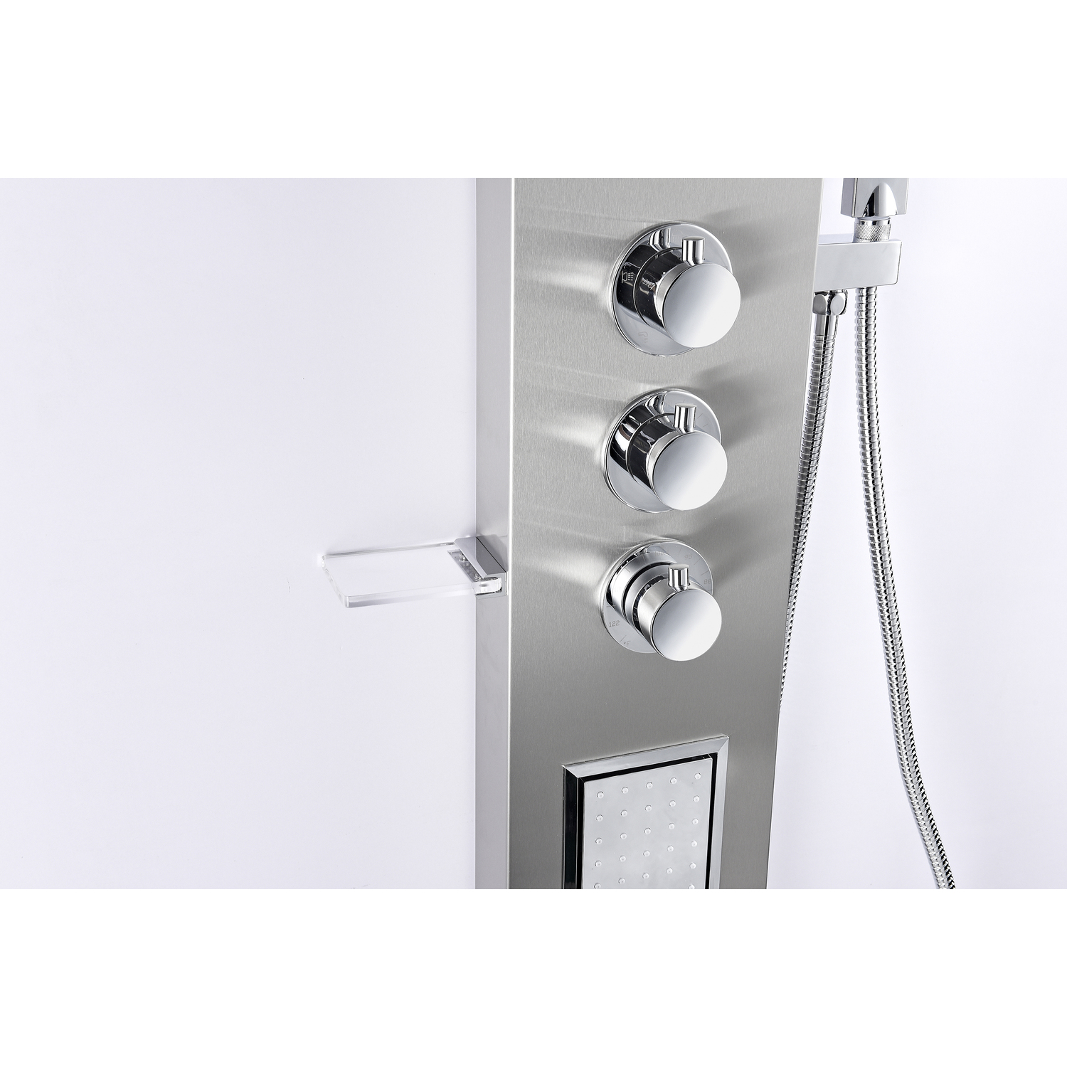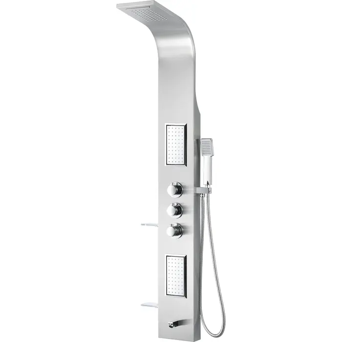 ANZZI is introducing the next level in personal jet stream shower technology with our latest series of elegant and reliably performing shower panels. The ANZZI full tower Field shower panel features a modern laser cut brushed 304 stainless steel frame equipped with 2 Acu-Stream body jets providing a powerful water stream to massage the body. ANZZI shower panels feature true flow Heavy Rain performance hanging shower heads and Euro-Grip hand held sprayer. All features are controlled through 3 chrome finish thermostatic and diverter controls.Your order will include one (1) Field Full Body Shower Panel with Dual Level Deco-Glass Shampoo Shelfs, one (1) Heavy Rain shower head with cascading waterfall, two (2) Acu-Stream directional body jets, concentrated water spout, one (1) Euro-Grip free ranTwo (2) Acu-Stream directional vector massage body jetsThree (3) Shower control knobsFixed crested shower head with Heavy Rain water pressure technologyFree reign Euro-Grip handheld sprayer with 60" reachCrafted RHINO ALLOY certified 304 stainless steel body, solid brass valve interior, high grade ABS componentsWater saving 1.8gpm flow rate with 2.5gpm when reducer is removedDual Level Deco-Glass shampoo shelvesFlexible reinforced stainless steel supply hoses with standard .5" connectionShips from warehouse within 24 hours of order processingLimited Lifetime WarrantyTo speak to a knowledgeable and dedicated ANZZI specialist simply call 1-844-44-ANZZI or visit us on the web at www.ANZZI.com