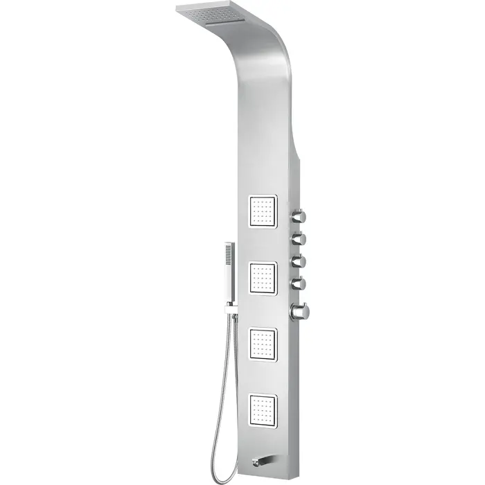 ANZZI is introducing the next level in personal jet stream shower technology with our latest series of elegant and reliably performing shower panels. The ANZZI full tower Mesa shower panel features a modern laser cut brushed 304 stainless steel frame equipped with 4 Acu-Stream body jets providing a powerful water stream to massage the body. ANZZI shower panels feature true flow Heavy Rain performance hanging shower heads and Euro-Grip hand held sprayer. All features are controlled through 5 chrome finish thermostatic and diverter controls.Your order will include one (1) Mesa Full Body Shower Panel, one (1) Heavy Rain shower head with cascading waterfall, four (4) Acu-Stream directional body jets, concentrated water spout, one (1) Euro-Grip free range hand sprayer, one (1) owner's manualfour (4) Acu-Stream directional vector massage body jetsFive (5) Shower control knobsFixed crested shower head with Heavy Rain water pressure technologyFree reign Euro-Grip handheld sprayer with 60" reachCrafted RHINO ALLOY certified 304 stainless steel body, solid brass valve interior, high grade ABS componentsWater saving 1.8gpm flow rateWater diverter control for fully customizable shower experienceFlexible reinforced stainless steel supply hoses with standard .5" connectionShips from warehouse within 24 hours of order processingLimited Lifetime WarrantyTo speak to a knowledgeable and dedicated ANZZI specialist simply call 1-844-44-ANZZI or visit us on the web at www.ANZZI.com