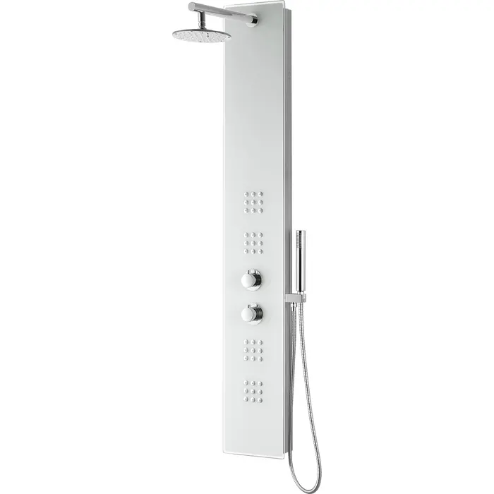 ANZZI is introducing the next level in personal jet stream shower technology with our latest series of elegant and reliably performing shower panels. The ANZZI full tower Veld shower panel features a modern laser cut tempered Deco-Glass frame equipped with 2 Acu-Stream body jets providing a powerful water stream to massage the body. ANZZI shower panels feature true flow Heavy Rain performance hanging shower heads and Euro-Grip hand held sprayer. All features are controlled through 2 chrome finish thermostatic and diverter controls.Your order will include one (1) Veld Full Body Shower Panel, one (1) Heavy Rain shower head, two (2) Acu-Stream body jet sets, one (1) Euro-Grip free range hand sprayer, one (1) owner's manualtwo (2) Acu-Stream vector massage body jet setsTwo (2) Shower control knobsSwiveling crested shower head with Heavy Rain water pressure technologyFree reign Euro-Grip handheld sprayer with 60" reachCrafted RHINO ALLOY certified tempered Deco-Glass body, solid brass valve interior, high grade ABS componentsWater diverter control for fully customizable shower experienceFlexible reinforced stainless steel supply hoses with standard .5" connectionShips from warehouse within 24 hours of order processingLimited Lifetime WarrantyTo speak to a knowledgeable and dedicated ANZZI specialist simply call 1-844-44-ANZZI or visit us on the web at www.ANZZI.com