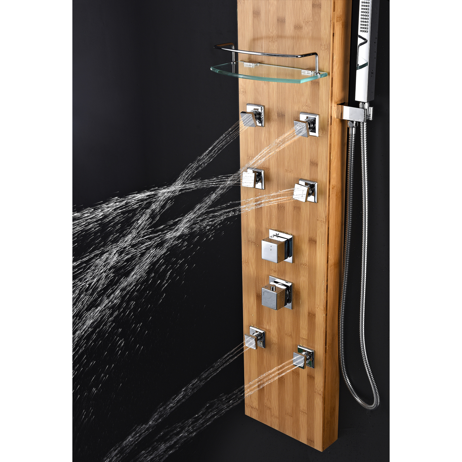 ANZZI is introducing the next level in personal jet stream shower technology with our latest series of elegant and reliably performing shower panels. The ANZZI full tower Crane shower panel features a modern laser cut natural bamboo frame equipped with 6 Acu-Stream body jets providing a powerful water stream to massage the body. ANZZI shower panels feature true flow Heavy Rain performance hanging shower heads and Euro-Grip hand held sprayer. All features are controlled through 2 chrome finish thermostatic and diverter controls.Your order will include one (1) Crane Full Body Shower Panel with Deco-Glass Shampoo Shelf, one (1) Heavy Rain shower head, six (6) Acu-Stream directional body jets, one (1) Euro-Grip free range hand sprayer, one (1) owner's manualsix (6) Acu-Stream directional vector massage body jetsTwo (2) Shower control knobsSwiveling crested shower head with Heavy Rain water pressure technologyFree reign Euro-Grip handheld sprayer with 60" reachCrafted RHINO ALLOY certified natural bamboo body, solid brass valve interior, high grade ABS componentsReach Level Deco-Glass shampoo shelfFlexible reinforced stainless steel supply hoses with standard .5" connectionShips from warehouse within 24 hours of order processingTo speak to a knowledgeable and dedicated ANZZI specialist simply call 1-844-44-ANZZI or visit us on the web at www.ANZZI.com