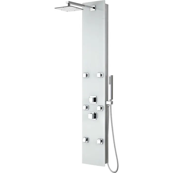 The ANZZI full body Jaguar shower panel features a modern laser cut Tempered Glass body with 6 Acu-Stream body jets provide a relaxing yet powerful water stream to massage the body. The Heavy Rain shower head hangs overhead releasing a steady torrent of soothing water from above. And finally, always positioned at the column's flank is the Euro-Grip hand held sprayer with free reign reach of up to 60"es. And everything is controlled through 2 chrome thermostatic and diverter controls.Your order will include one (1) ANZZI Jaguar Full Body Shower Panel, one (1) Heavy Rain shower head, Six (6) Acu-Stream body massage jets, one (1) Euro-Grip free range hand sprayer, one (1) owner's manualSix (6) directional Acu-Stream body jets in polished chrome2 (Two) Shower control knobsSwiveling overhead shower with Heavy Rain water pressure technologyFree reign Euro-Grip handheld sprayer with 60" reach in polished chromeWhite Deco-Glass bodyWater saving 1.8gpm flow rate with 2.5gpm when reducer is removedCrafted using RHINO ALLOY solid brass valves and Tempered Deco-GlassWater diverter control for fully customizable shower experienceFlexible reinforced stainless steel supply hoses with standard .5" connectionAlready pre-plumbed for easy and straight forward, non-retrofit installationShips from warehouse within 24 hours of order processingLifetime WarrantyTo speak to a knowledgeable and dedicated ANZZI specialist simply call 1-844-44-ANZZI or visit us on the web at www.ANZZI.com