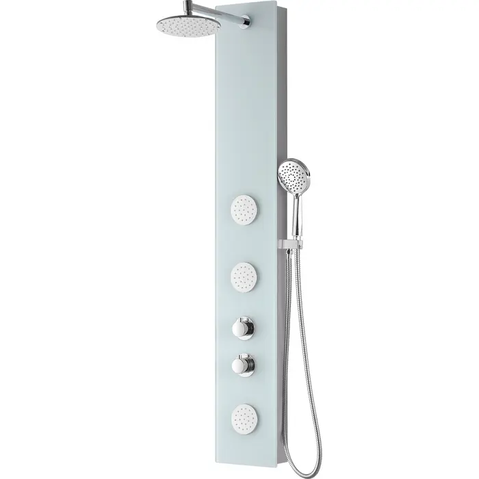 ANZZI is introducing the next level in personal jet stream shower technology with our latest series of elegant and reliably performing shower panels. The ANZZI full tower Titan shower panel features a modern laser cut tempered Deco-Glass frame equipped with 3 Acu-Stream body jets providing a powerful water stream to massage the body. ANZZI shower panels feature true flow Heavy Rain performance hanging shower heads and Euro-Grip hand held sprayer. All features are controlled through 2 chrome finish thermostatic and diverter controls.Your order will include one (1) Titan Full Body Shower Panel, one (1) Heavy Rain shower head, three (3) Acu-Stream body jet sets, one (1) Euro-Grip free range hand sprayer with dual massage and full settings, one (1) owner's manualThree (3) Acu-Stream vector massage body jet setsTwo (2) Shower control knobsSwiveling crested shower head with Heavy Rain water pressure technologyFree reign Euro-Grip handheld sprayer with dual Focused and Full stream actionCrafted RHINO ALLOY certified tempered Deco-Glass body, solid brass valve interior, high grade ABS componentsWater diverter control for fully customizable shower experienceFlexible reinforced stainless steel supply hoses with standard .5" connectionShips from warehouse within 24 hours of order processingLimited Lifetime WarrantyTo speak to a knowledgeable and dedicated ANZZI specialist simply call 1-844-44-ANZZI or visit us on the web at www.ANZZI.com