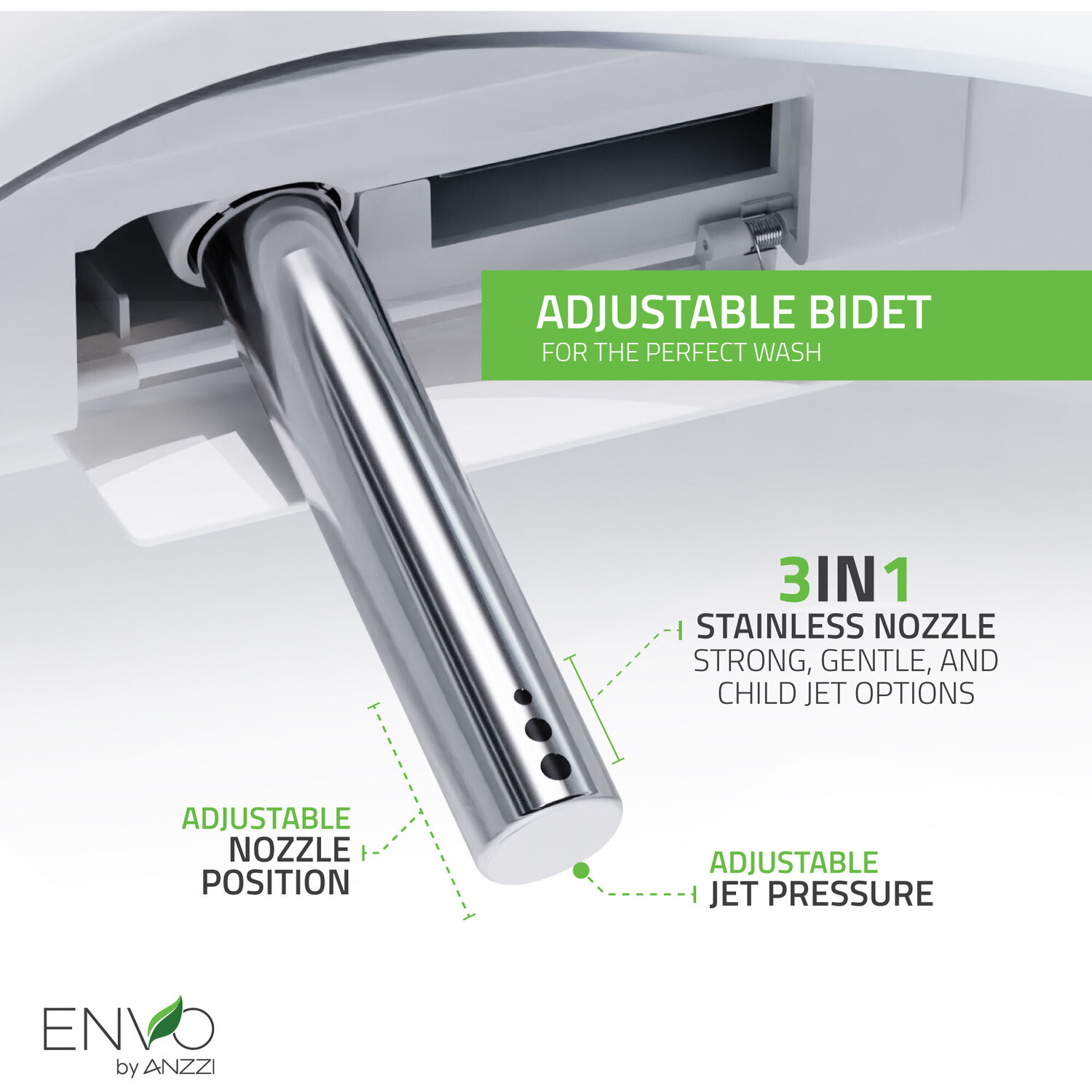 - ADJUSTABLE BIDET - Spray nozzle moves front to rear, back and forth for a thorough cleaning