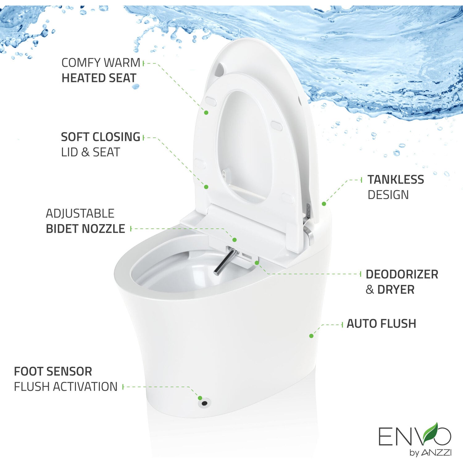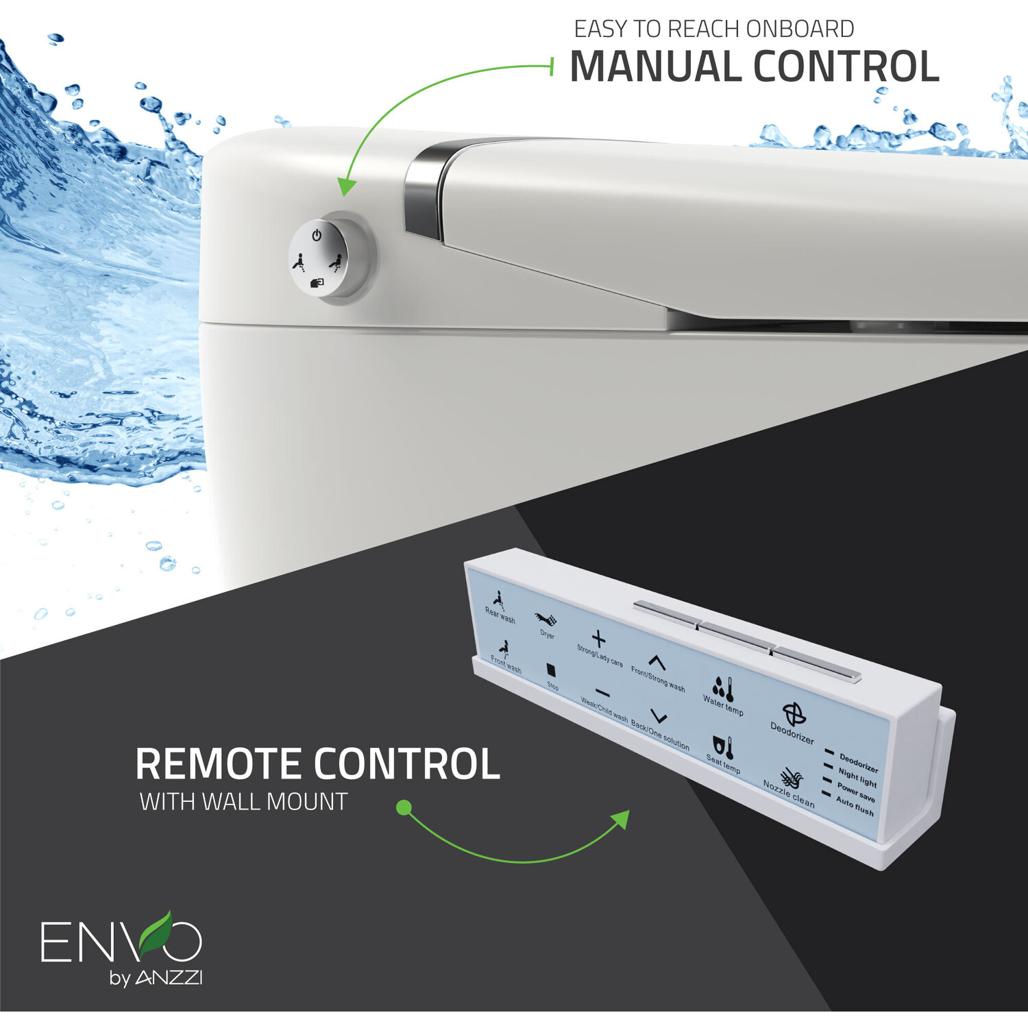 ADJUSTABLE BIDET - Spray nozzle moves front to rear, back and forth for a thorough cleaning3-IN-1 NOZZLE - Three spray modes — Weak/Child wash, Strong/Lady care wash, Strong washSANITARY - Made with super-sanitary nano-antibacterial materialsWATER FILTER - Water purifying filter guarantees you get the cleanest personal washingANTI-ODOR - Deodorizer automatically masks any odorsHEATED WATER - Water spray is maintained at a constant, comfortable temperatureHEATED SEAT - Larger seat has built-in warmer so you never sit down on a cold seatAUTO FLUSH - Convenient 4-way flushing — auto flush, foot sensor flush, remote flush, and manual control flushADJUSTABLE TO YOUR PREFERENCE - Dryer, water temperature and pressure are adjustable for your comfortREMOTE CONTROL - Easy-to-use remote control for touchless control of featuresNIGHTLIGHT - Nightlight makes it easy to see and use in the darkEmergency battery back-up system so you can use your toilet even when power is out (battery not included)Energy efficient — uses minimal electricityEfficient tankless design uses water only as you need it