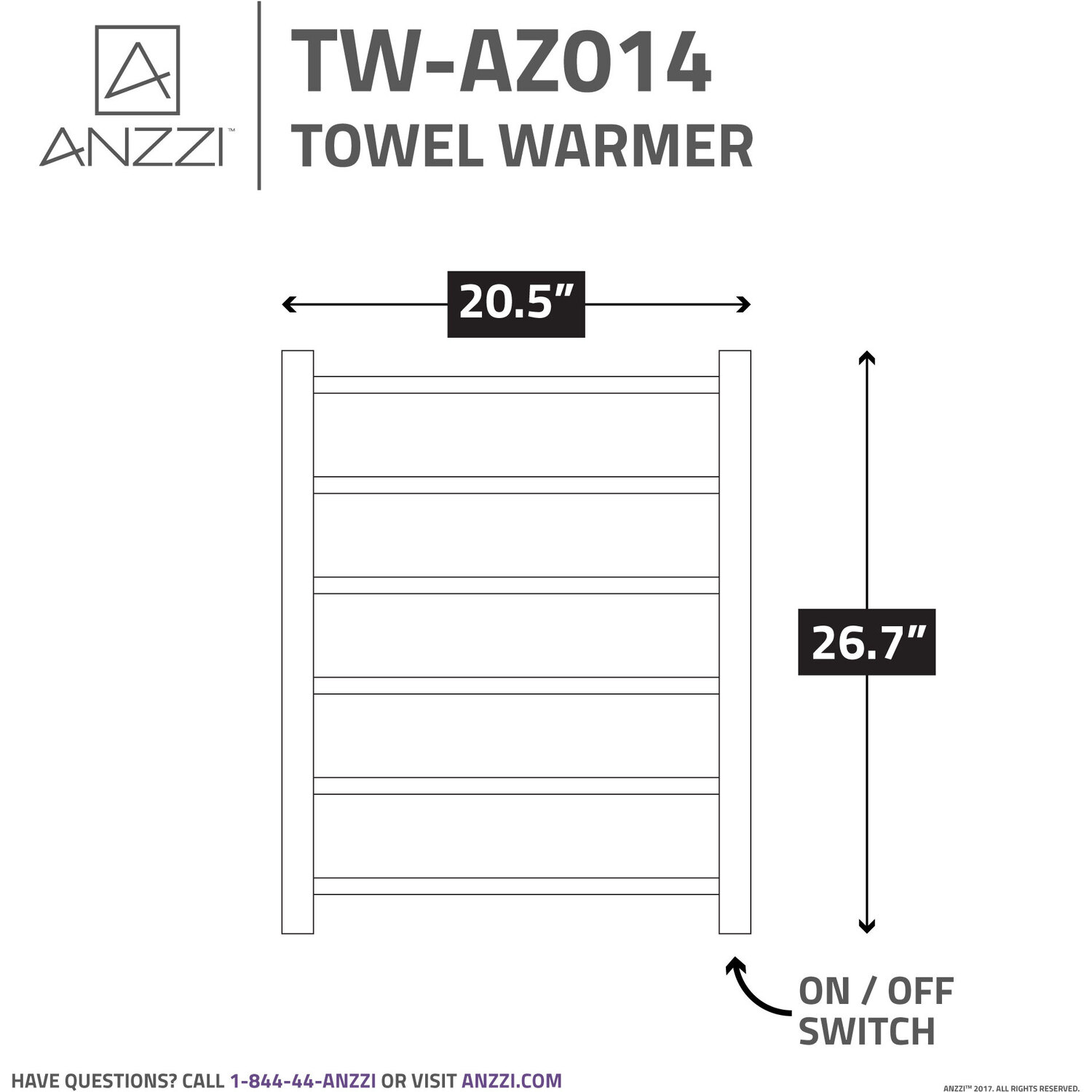 Wrap yourself in the embrace of a warm towel whenever you step out of the bath. Our ANZZI Charles Series towel warmer rack has a modern, minimalist design that complements any bathroom. The six sleek bars accommodate plenty of towels and installation is simple — just mount to the wall and plug it in! It’s safe, reliable, energy efficient and warms up in just 20 minutes. The Rhino Alloy-certified stainless steel is finished in attractive Brushed Nickel.Warms up in just 20 minutesMade from Rhino Alloy-certified stainless steelBeautiful Brushed Nickel finishEasy-to-use on/off switchSimple wall mount installation (minimal assembly required)No wiring required — just plug in to existing outletDimensions: 20.47 in. W x 26.77 in. H x 4.33 in. DUL certified to meet all national safety standards68 watts of power, 110 voltsGet it fast — ships from warehouse within 24 hours of order processingProtected by our Lifetime WarrantyTo speak to a knowledgeable ANZZI specialist, simply call 1-844-44-ANZZI or visit us on the web at www.ANZZI.com
