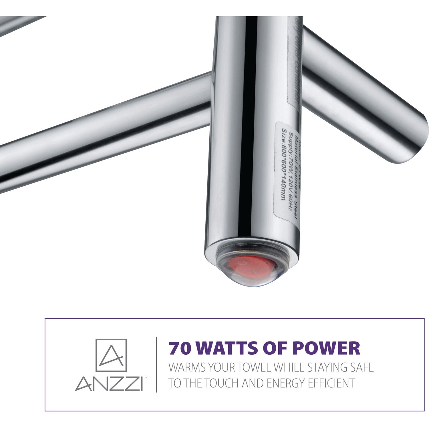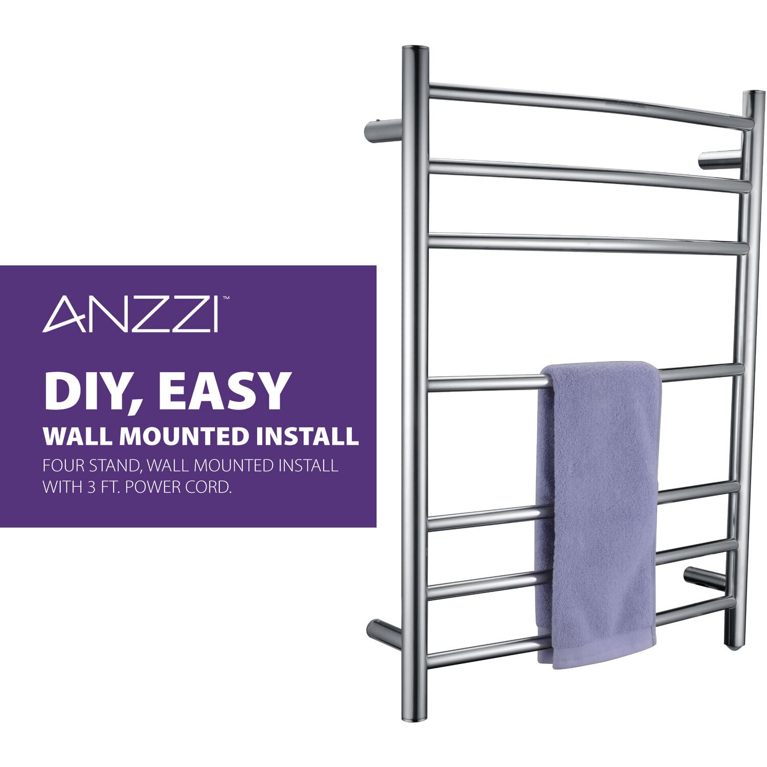 You deserve a little luxury, and our Gown Electric Towel Warmer delivers. Switch it on and the seven sleek bars deliver a load of toasty towels in just 20 minutes. Installation couldn’t be easier — just mount to the wall and plug it in. Made from Rhino Alloy-certified stainless steel finished in striking Polished Chrome.Warms up in just 20 minutesMade from Rhino Alloy-certified stainless steelBeautiful Polished Chrome finishEasy-to-use on/off switchSimple wall mount installation (minimal assembly required)No wiring required — just plug in to existing outletDimensions: 31.5 in. H x 23.6 in. W x 5.5 in. DUL certified to meet all national safety standards70 watts of power, 110 voltsGet it fast — ships from warehouse within 24 hours of order processingProtected by our Lifetime WarrantyTo speak to a knowledgeable ANZZI specialist, simply call 1-844-44-ANZZI or visit us on the web at www.ANZZI.com