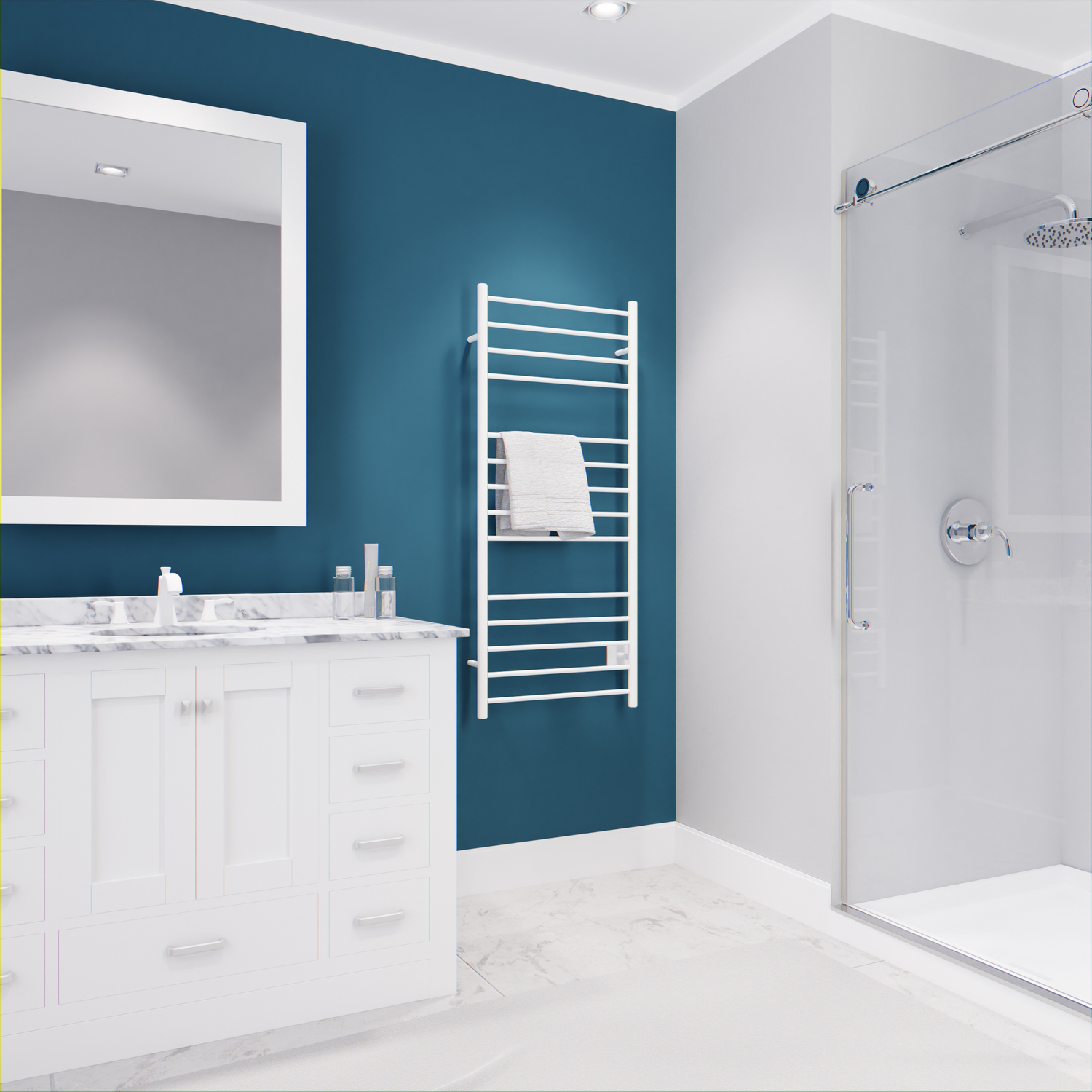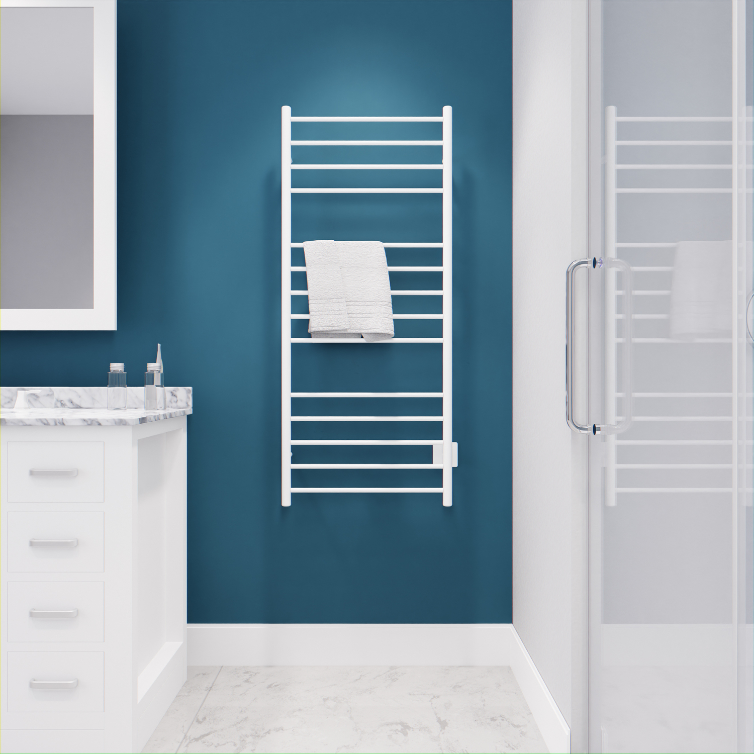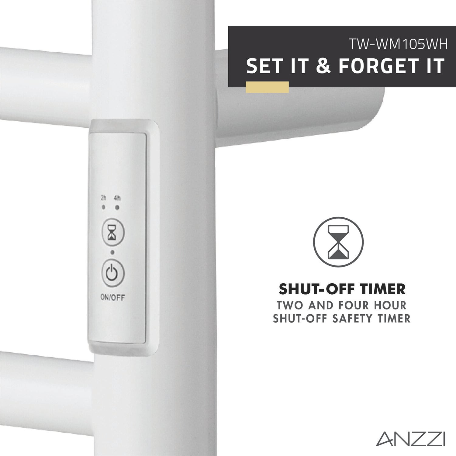 What could be better than a warm, toasty towel waiting for you when you step out of the bath or shower? This premium carbon steel towel rack heats up in just 20 minutes with the press of a button. The 14 stainless steel bar design offers a plenty of area to warm even the largest towels. The rack mounts quickly and easily to your bathroom wall hardwired or just plug it in to the nearest outlet and you’re ready to go!14 heated bars warm up in just 20 minutes (additional time required to warm towel)Maintains a temperature of 104°F–122°F for quick towel warmingMade from premium Rhino Alloy-certified carbon steelBeautiful White powder-coated finishWaterproof on/off switch is easy to useSimple wall mount installation (minimal assembly required)Hardwired or wall plug-in optionDimensions: 20.86 in. W x 48.62 in. H x 4.13 in. D200 watts of power, 120 voltsGet it fast — ships from warehouse within 24 hours of order processingProtected by our Lifetime WarrantyAlso available in Matte Black finish, TW-WM105MBTo speak to a knowledgeable and dedicated ANZZI specialist simply call 1-844-44-ANZZI or visit us on the web at www.ANZZI.com