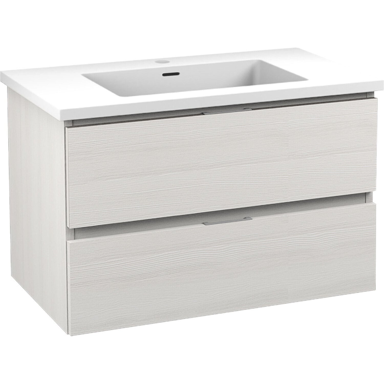 Set includes vanity with top and sink, and mounting hardwareOverall dimensions: 30 in. W x 20 in. H x 18 in. DBasin dimensions: 17.7 in. W x 11.2 in. L x 3.5 in. DSink and countertop are crafted from beautiful and durable solid surface man-made stone that’s finished in Glossy WhiteSoft closing drawers are nearly impossible to slam — give them a push and they catch and gently closeVanity includes a removable insert tray that’s ideal for organizing and storing your personal care productsWall-mounted design is a stylish and modern alternative to traditional floor-mounted vanitiesComposite wood construction has a beautifully textured finish for a unique, premium lookSturdy aluminum chassis won’t rustAll hardware is Rhino Alloy-certified to guarantee the best quality and long-lasting durabilitySink features a built-in overflow and pre-drilled faucet holeProtected by our Limited Lifetime WarrantyGet it fast — ships from warehouse within 24 hours of order processingSafe and convenient curbside delivery