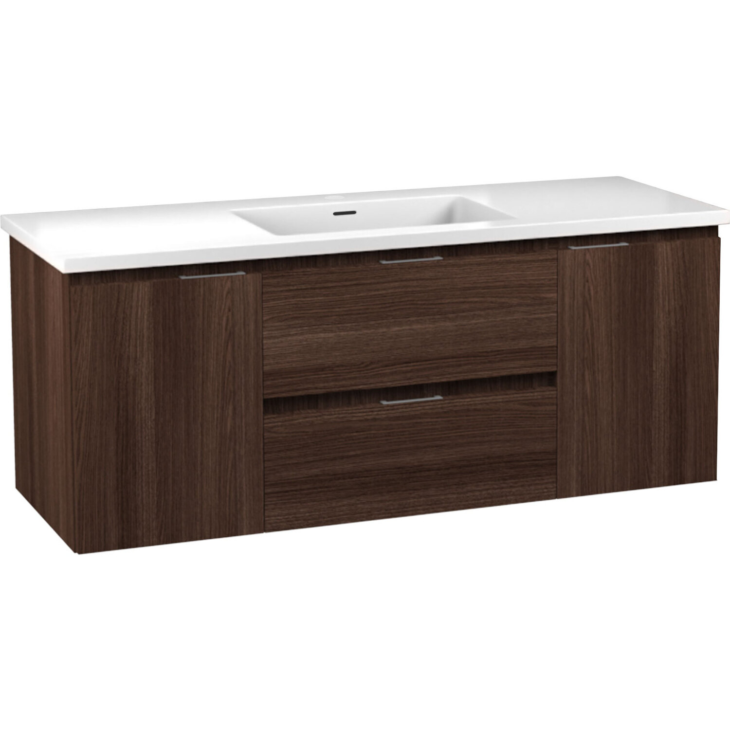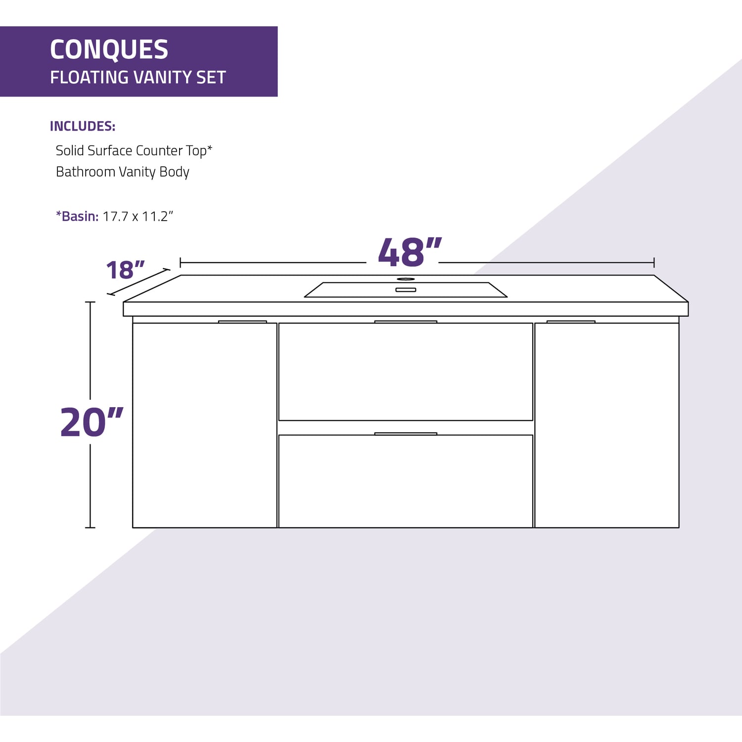 Set includes vanity with top and sink, and mounting hardwareOverall dimensions: 48 in. W x 20 in. H x 18 in. DBasin dimensions: 17.7 in. W x 11.2 in. L x 3.5 in. DSink and countertop are crafted from beautiful and durable solid surface man-made stone that’s finished in Glossy WhiteSoft closing drawers are nearly impossible to slam — give them a push and they catch and gently closeVanity includes a removable insert tray that’s ideal for organizing and storing your personal care productsWall-mounted design is a stylish and modern alternative to traditional floor-mounted vanitiesComposite wood construction has a beautifully textured finish for a unique, premium lookSturdy aluminum chassis won’t rustAll hardware is Rhino Alloy-certified to guarantee the best quality and long-lasting durabilitySink features a built-in overflow and pre-drilled faucet holeProtected by our Limited Lifetime WarrantyGet it fast — ships from warehouse within 24 hours of order processingSafe and convenient curbside delivery