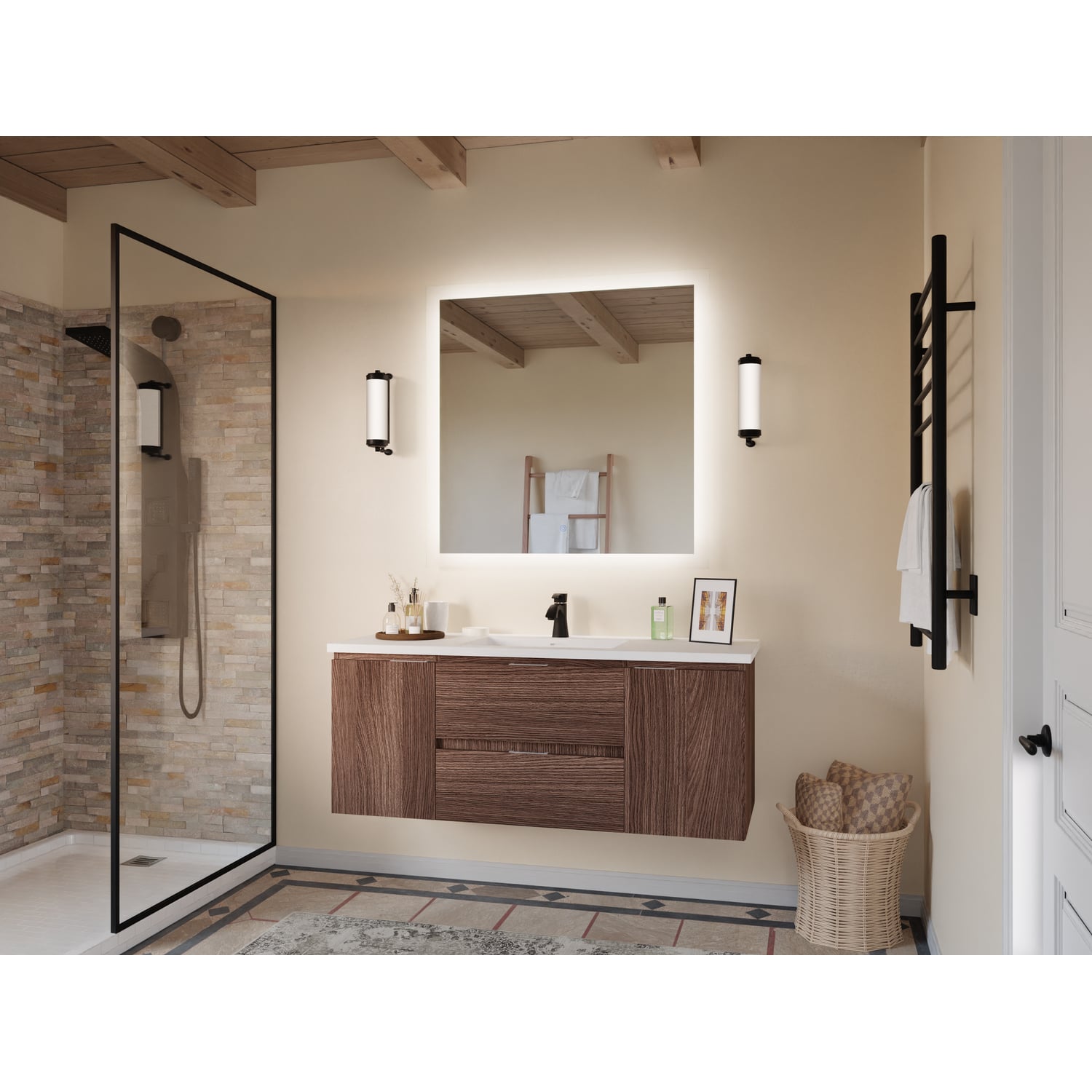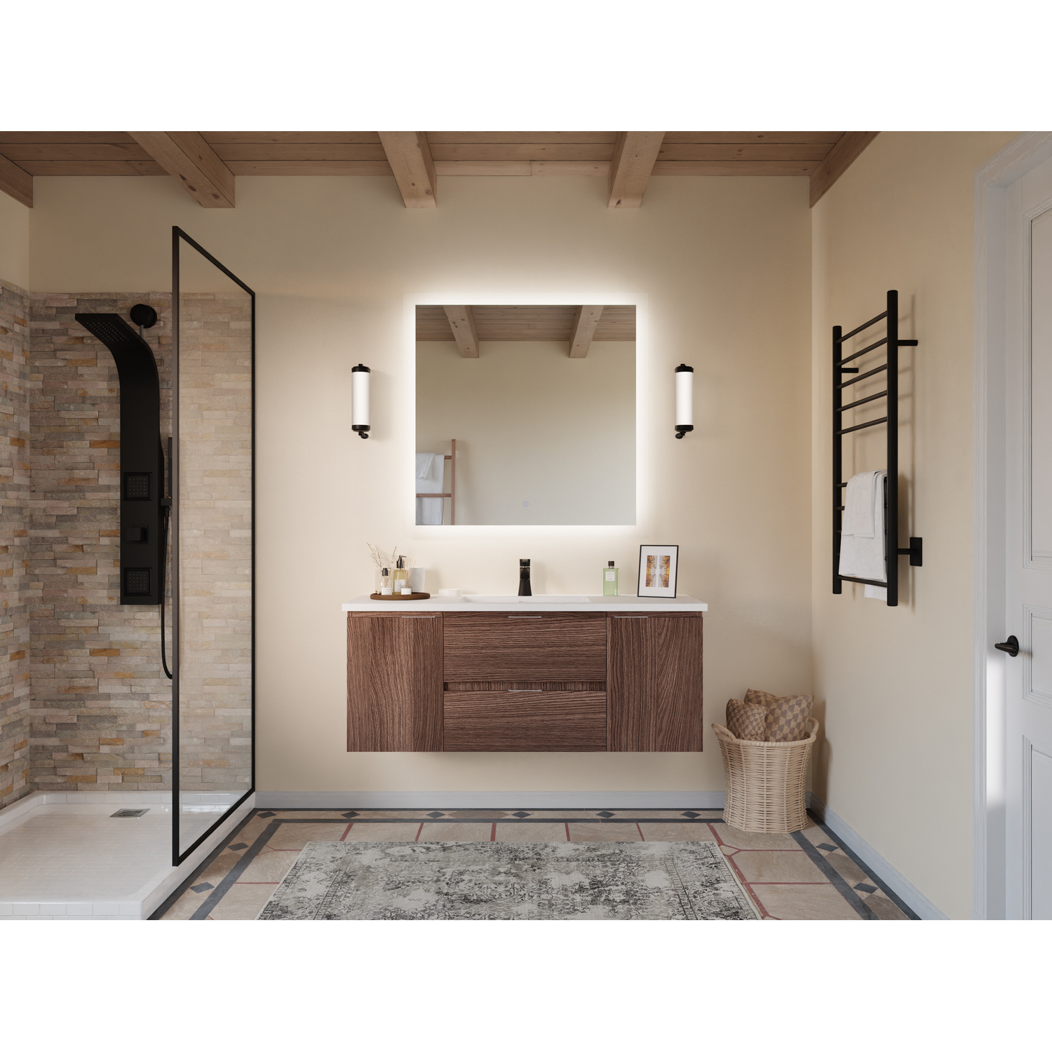 - Wall-mounted design is a stylish and modern alternative to traditional floor-mounted vanities