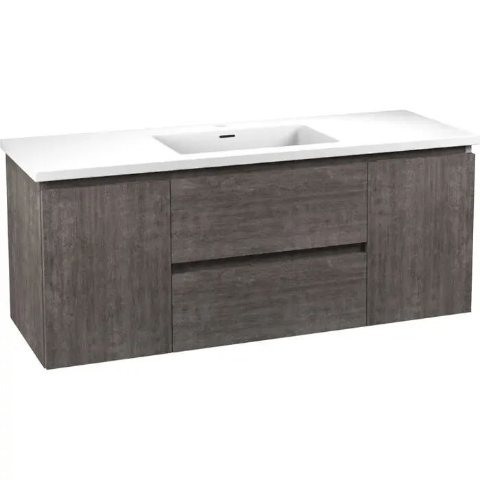 Set includes vanity with top and sink, and mounting hardwareOverall dimensions: 48 in. W x 20 in. H x 18 in. DBasin dimensions: 17.7 in. W x 11.2 in. L x 3.5 in. DSink and countertop are crafted from beautiful and durable solid surface man-made stone that’s finished in Glossy WhiteSoft closing drawers are nearly impossible to slam — give them a push and they catch and gently closeVanity includes a removable insert tray that’s ideal for organizing and storing your personal care productsWall-mounted design is a stylish and modern alternative to traditional floor-mounted vanitiesComposite wood construction has a beautifully textured finish for a unique, premium lookSturdy aluminum chassis won’t rustAll hardware is Rhino Alloy-certified to guarantee the best quality and long-lasting durabilitySink features a built-in overflow and pre-drilled faucet holeProtected by our Limited Lifetime WarrantyGet it fast — ships from warehouse within 24 hours of order processingSafe and convenient curbside delivery