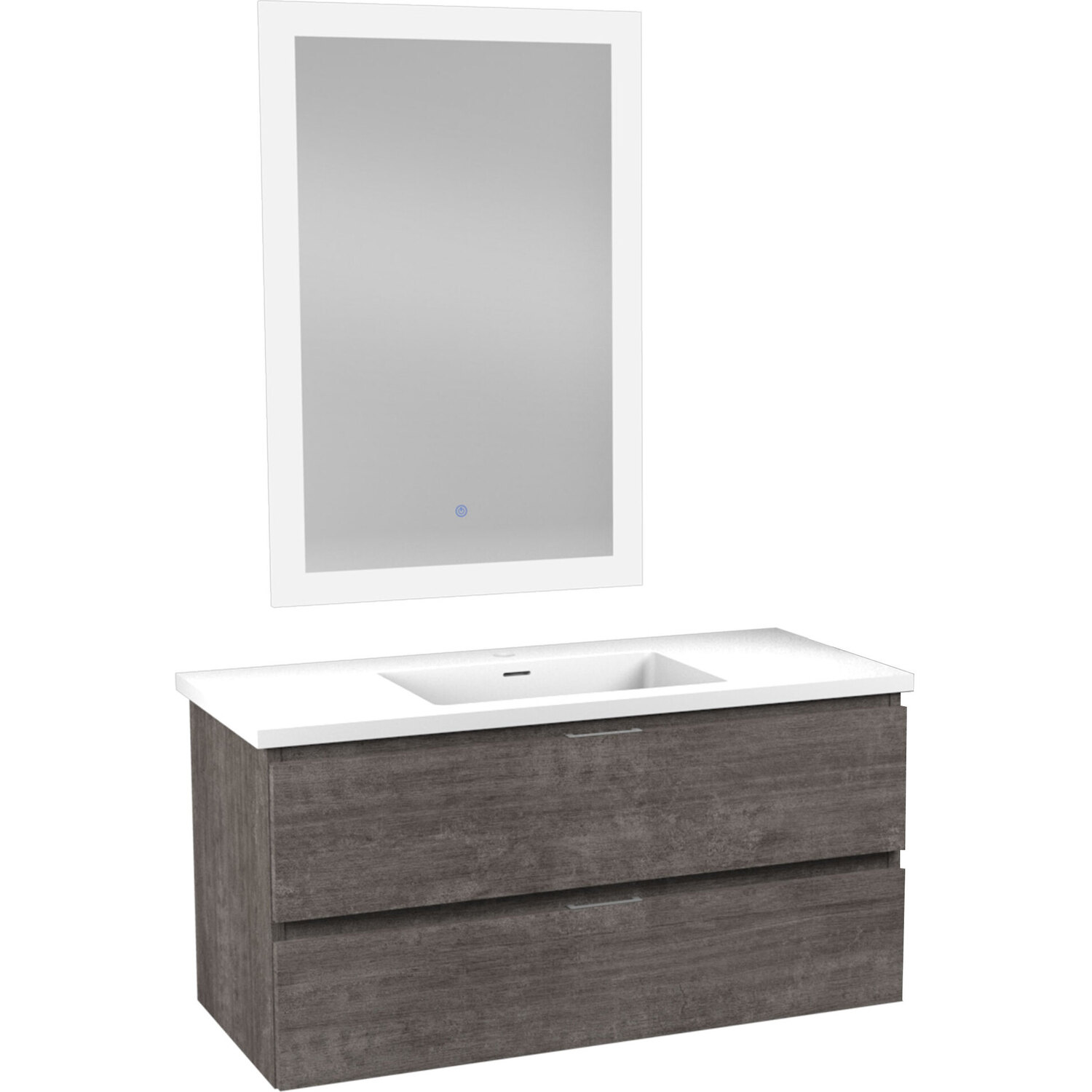 Set includes vanity with top and sink, LED mirror and mounting hardwareOverall dimensions: 39 in. W x 20 in. H x 18 in. DMirror dimensions: 24 in. W x 36 in. HBasin dimensions: 17.7 in. W x 11.2 in. L x 3.5 in. DSink and countertop are crafted from beautiful and durable solid surface man-made stone that’s finished in Glossy WhiteThe fog-free LED mirror is ETL certified for all North American Safety standardsEasy-to-use Touch Sense control lets you activate and adjust mirror lights and defogger with a simple press of a button3000K+6000K LED strip adjusts from warm yellow to cool white, so you can customize the light temperature to fit your mood and your bathroom spaceBuilt-in diffusers keep light output even and consistent, so it’s always comfortable for your eyesDefogger quickly eliminates condensation so mirror is clear when you’re done bathing or showeringSoft closing drawers are nearly impossible to slam — give them a push and they catch and gently closeVanity includes a removable insert tray that’s ideal for organizing and storing your personal care productsWall-mounted design is a stylish and modern alternative to traditional floor-mounted vanitiesComposite wood construction has a beautifully textured finish for a unique, premium look