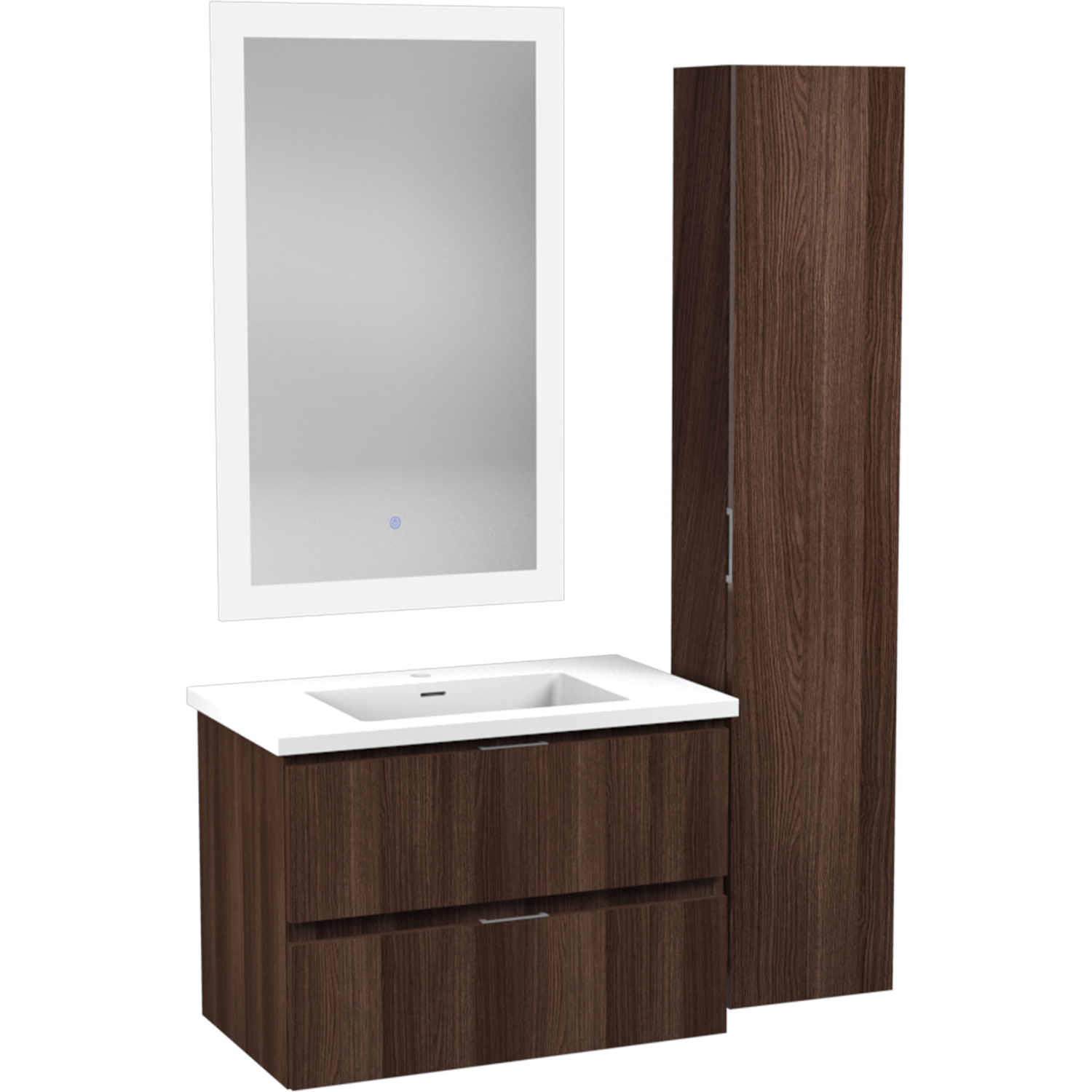 Set includes vanity with top and sink, side cabinet, LED mirror and mounting hardwareOverall dimensions: 30 in. W x 20 in. H x 18 in. DMirror dimensions: 24 in. W x 36 in. HSide cabinet dimensions: 12 in. W x 55 in. H x 9 in. DBasin dimensions: 17.7 in. W x 11.2 in. L x 3.5 in. DSink and countertop are crafted from beautiful and durable solid surface man-made stone that’s finished in Glossy WhiteThe fog-free LED mirror is ETL certified for all North American Safety standardsEasy-to-use Touch Sense control lets you activate and adjust mirror lights and defogger with a simple press of a button3000K+6000K LED strip adjusts from warm yellow to cool white, so you can customize the light temperature to fit your mood and your bathroom spaceBuilt-in diffusers keep light output even and consistent, so it’s always comfortable for your eyesDefogger quickly eliminates condensation so mirror is clear when you’re done bathing or showeringSoft closing doors and drawers are nearly impossible to slam — give them a push and they catch and gently closeVanity includes a removable insert tray that’s ideal for organizing and storing your personal care productsWall-mounted design is a stylish and modern alternative to traditional floor-mounted vanities