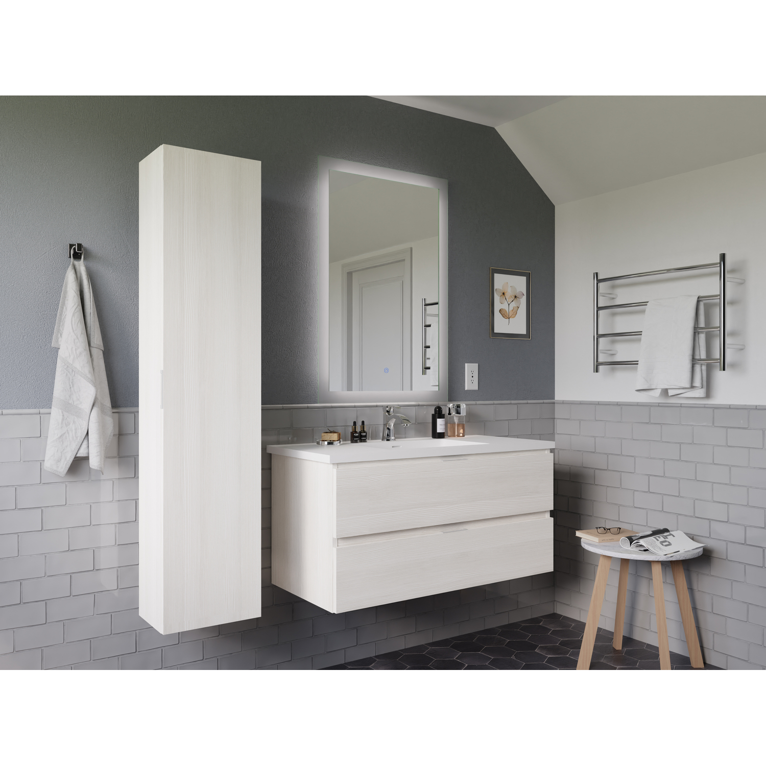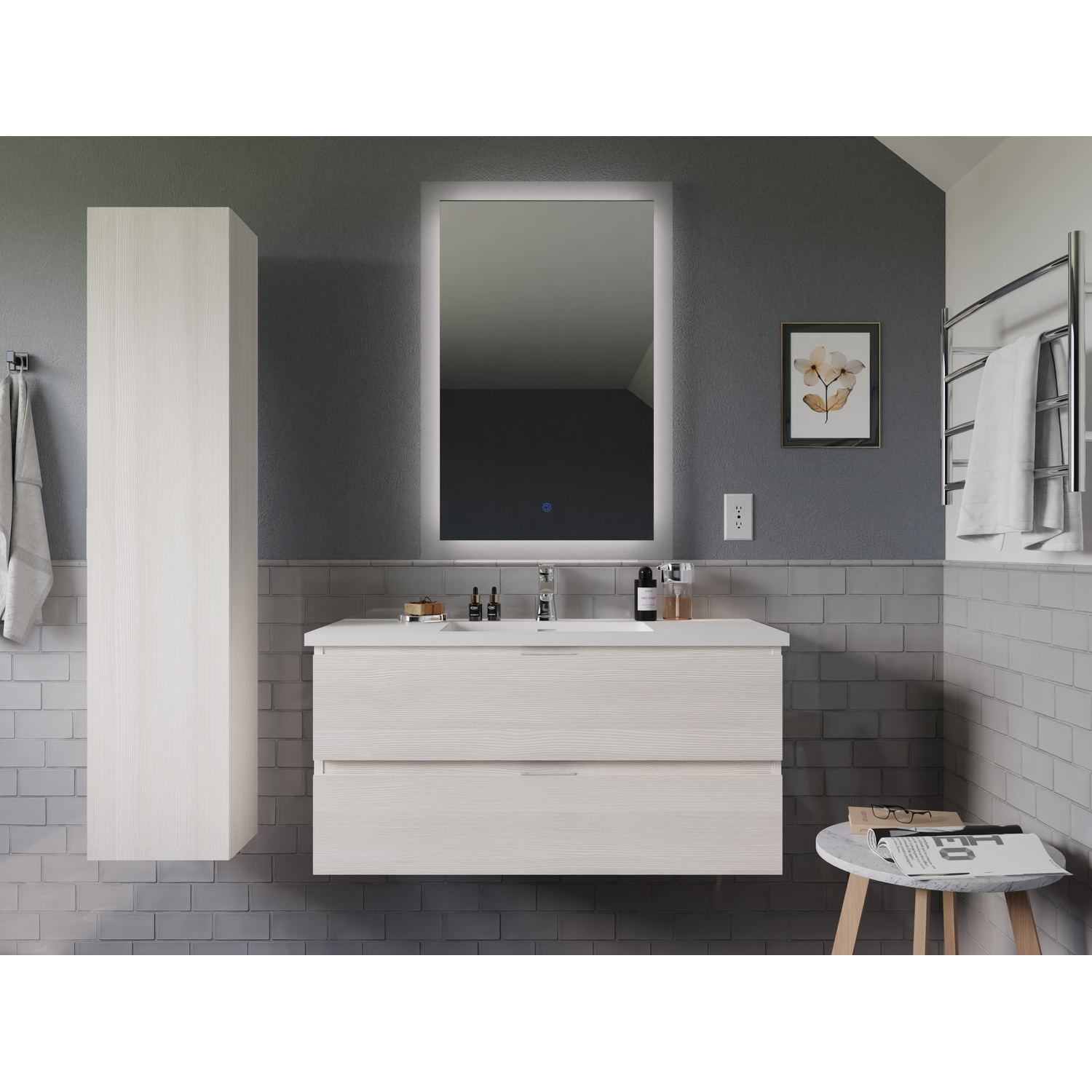 This smart-looking set asserts its individuality with a clever combination of style and function. The vanity features two spacious drawers that are perfect for storing and organizing personal care items. It’s topped with a man-made stone counter and sink finished in a gorgeous Glossy White. The side cabinet makes a great place to store towels and linens in one convenient location. The LED mirror features adjustable light temperatures and a built-in defogger that clears condensation from its surface.
