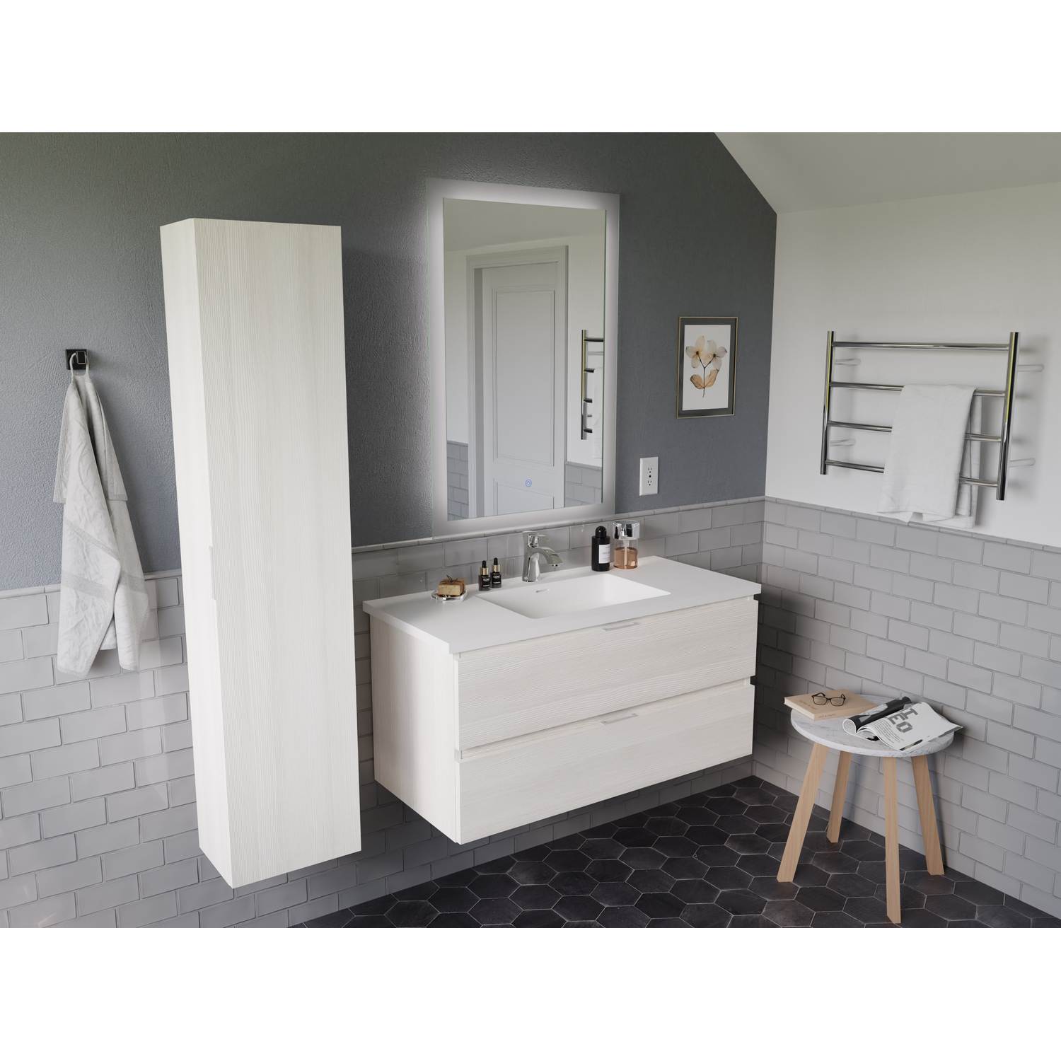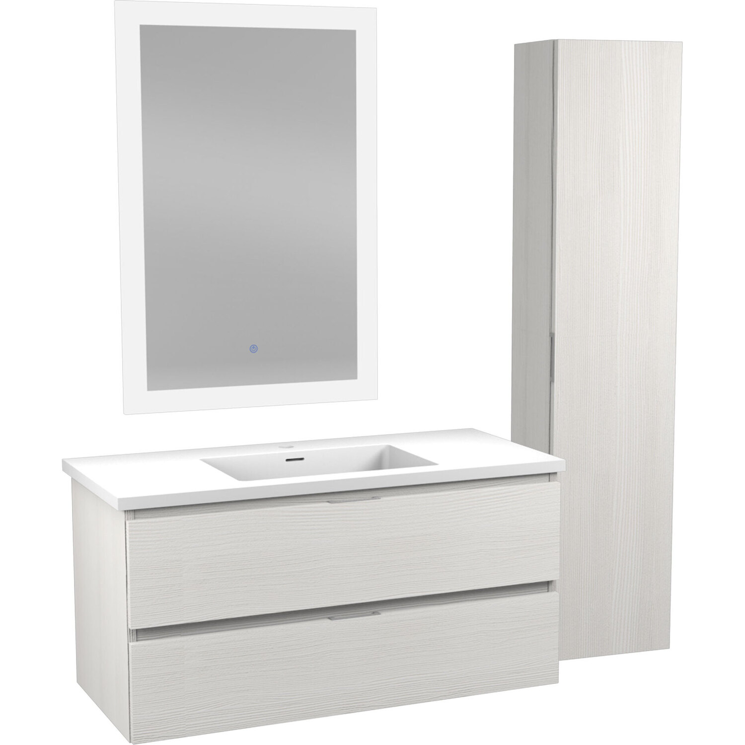 Set includes vanity with top and sink, side cabinet, LED mirror and mounting hardwareOverall dimensions: 39 in. W x 20 in. H x 18 in. DMirror dimensions: 24 in. W x 36 in. HSide cabinet dimensions: 12 in. W x 55 in. H x 9 in. DBasin dimensions: 17.7 in. W x 11.2 in. L x 3.5 in. DSink and countertop are crafted from beautiful and durable solid surface man-made stone that’s finished in Glossy WhiteThe fog-free LED mirror is ETL certified for all North American Safety standardsEasy-to-use Touch Sense control lets you activate and adjust mirror lights and defogger with a simple press of a button3000K+6000K LED strip adjusts from warm yellow to cool white, so you can customize the light temperature to fit your mood and your bathroom spaceBuilt-in diffusers keep light output even and consistent, so it’s always comfortable for your eyesDefogger quickly eliminates condensation so mirror is clear when you’re done bathing or showeringSoft closing doors and drawers are nearly impossible to slam — give them a push and they catch and gently closeVanity includes a removable insert tray that’s ideal for organizing and storing your personal care productsWall-mounted design is a stylish and modern alternative to traditional floor-mounted vanities
