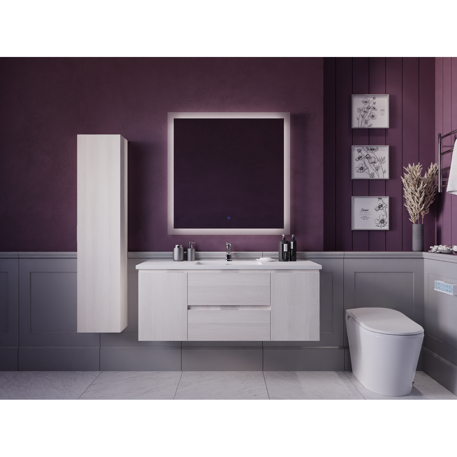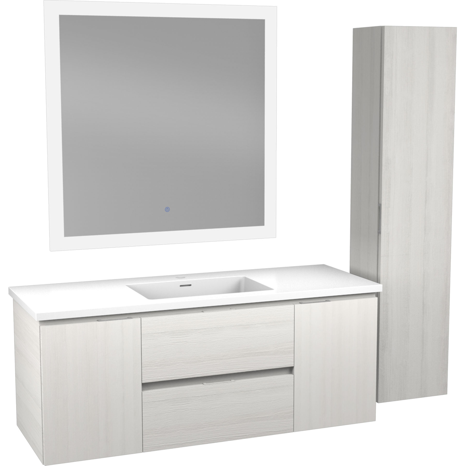 Set includes vanity with top and sink, side cabinet, LED mirror and mounting hardwareOverall dimensions: 48 in. W x 20 in. H x 18 in. DMirror dimensions: 36 in. W x 36 in. HSide cabinet dimensions: 12 in. W x 55 in. H x 9 in. DBasin dimensions: 17.7 in. W x 11.2 in. L x 3.5 in. DSink and countertop are crafted from beautiful and durable solid surface man-made stone that’s finished in Glossy WhiteThe fog-free LED mirror is ETL certified for all North American Safety standardsEasy-to-use Touch Sense control lets you activate and adjust mirror lights and defogger with a simple press of a button3000K+6000K LED strip adjusts from warm yellow to cool white, so you can customize the light temperature to fit your mood and your bathroom spaceBuilt-in diffusers keep light output even and consistent, so it’s always comfortable for your eyesDefogger quickly eliminates condensation so mirror is clear when you’re done bathing or showeringSoft closing doors and drawers are nearly impossible to slam — give them a push and they catch and gently closeVanity includes a removable insert tray that’s ideal for organizing and storing your personal care productsWall-mounted design is a stylish and modern alternative to traditional floor-mounted vanities