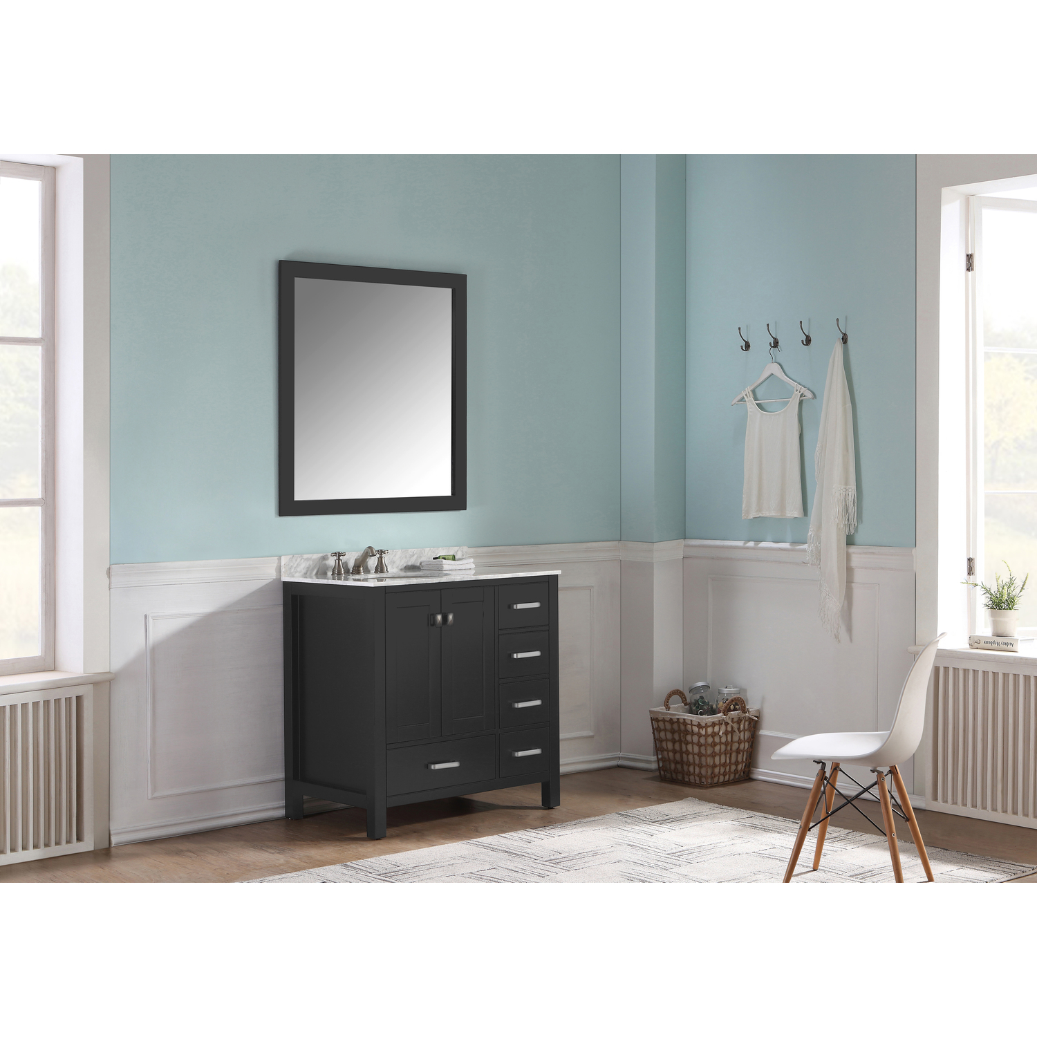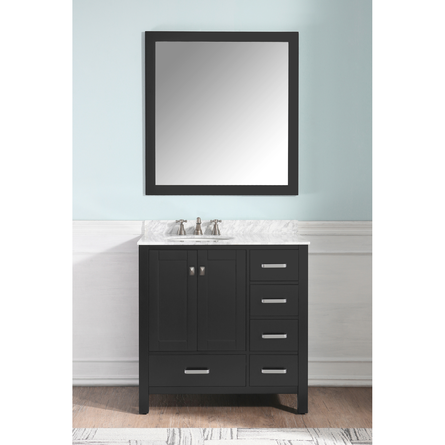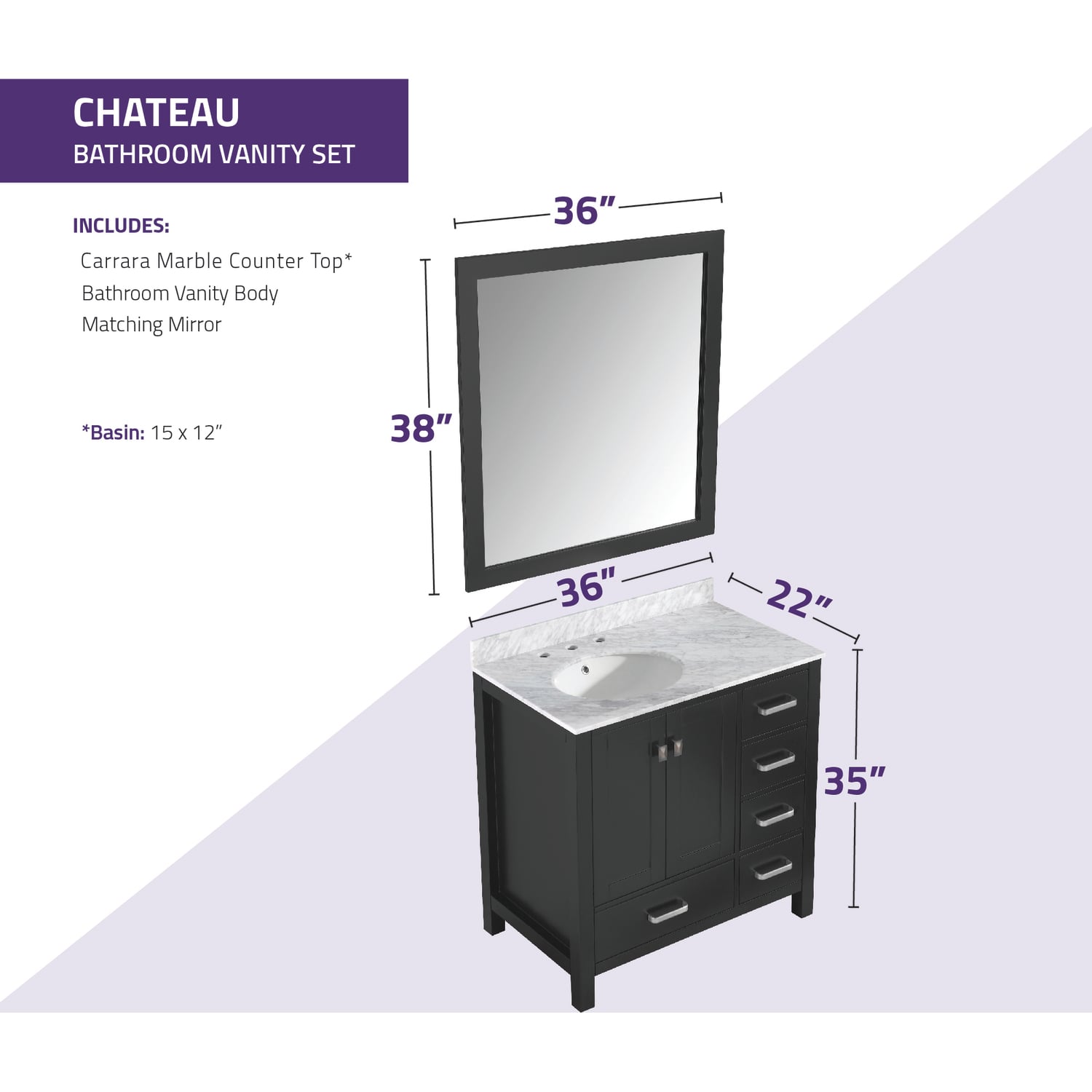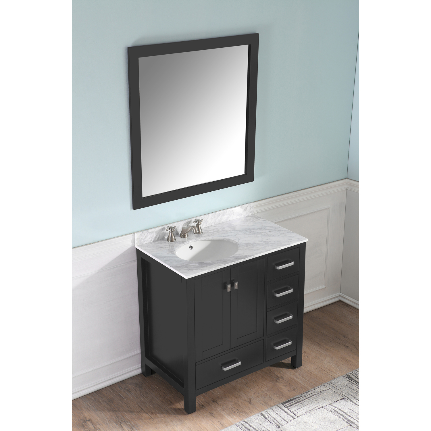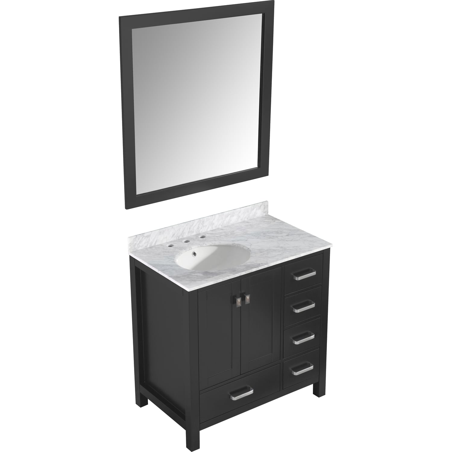Included: Rich black vanity body, Carrara White Marble counter top, white ceramic basin sink, black wall mounted mirror, brushed and satin hardwareHandmade wooden cabinet body in a rich black finishBrilliant brushed and satin finish hardwareLuxurious Carrara White Marble counter topMarine grade ceramic basin sink in stunning white finish with built in overflow; drain assembly not includedMatching wall mounted silver glassed mirror offering crisply sharp reflectivenessANZZI Paladin Protection finish is an anti-scratch shielding that makes our wood finishes nigh impervious to scratches and scuffsRHINO ALLOY certified materialsANZZI's kinetic cushioning protects your cabinets hardware and finish from slamming doors or drawersFive (5) soft closing drawers with hidden tracksTwo (2) soft closing cabinet doorsOverall Dimensions: 36 in. W x 22 in. D x 35 in. HMirror dimensions: 36 in. W x 38 in. HThree (3) pre-drilled holes for an 8 in. widespread faucet