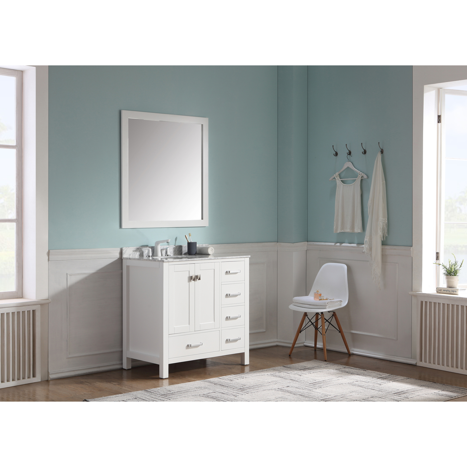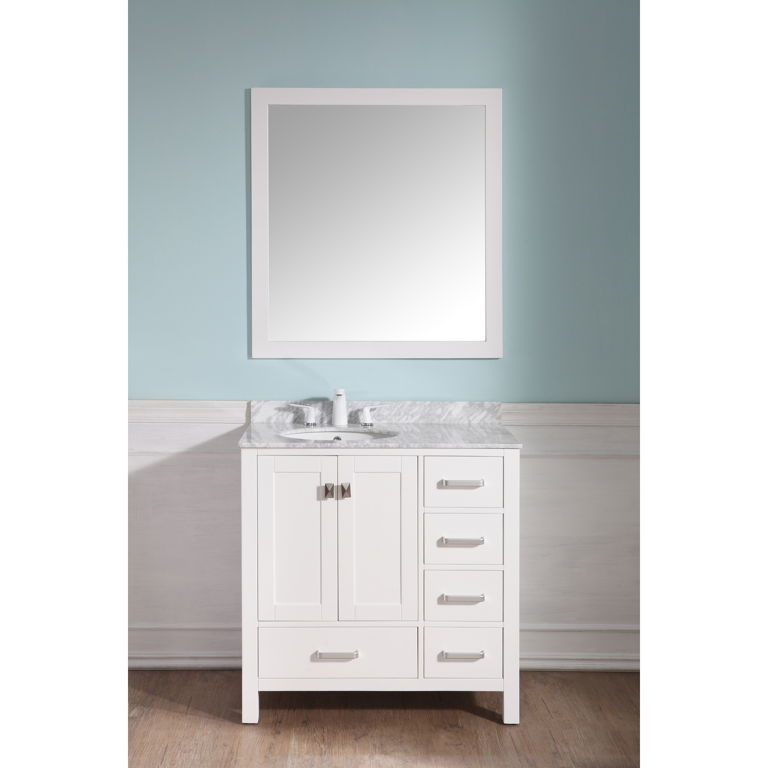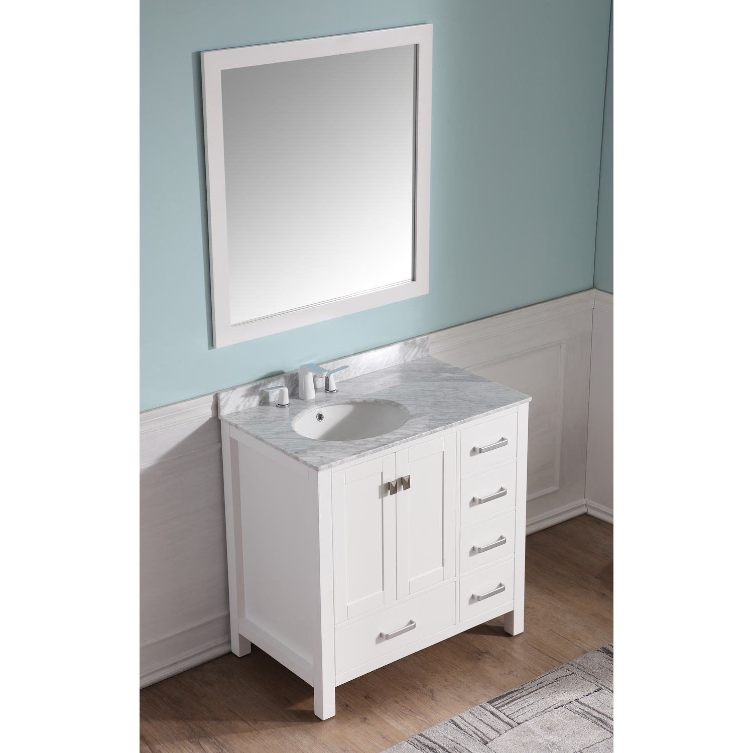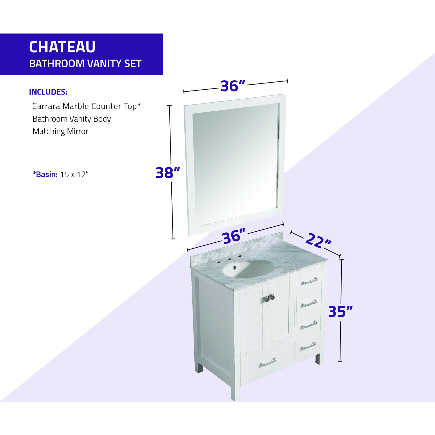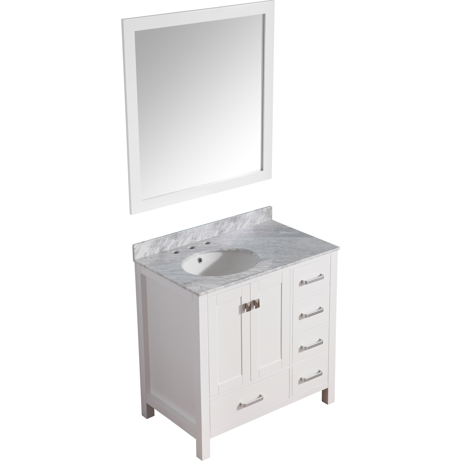 Included: Rich white vanity body, Carrara White Marble counter top, white ceramic basin sink, white wall mounted mirror, brushed and satin hardwareHandmade wooden cabinet body in a rich white finishBrilliant brushed and satin finish hardwareLuxurious Carrara White Marble counter topMarine grade ceramic basin sink in stunning white finish with built in overflow; drain assembly not includedMatching wall mounted silver glassed mirror offering crisply sharp reflectivenessANZZI Paladin Protection finish is an anti-scratch shielding that makes our wood finishes nigh impervious to scratches and scuffsRHINO ALLOY certified materialsANZZI's kinetic cushioning protects your cabinets hardware and finish from slamming doors or drawersFive (5) soft closing drawers with hidden tracksTwo (2) soft closing cabinet doorsOverall Dimensions: 36 in. W x 22 in. D x 35 in. HMirror dimensions: 36 in. W x 38 in. HThree (3) pre-drilled holes for an 8 in. widespread faucet