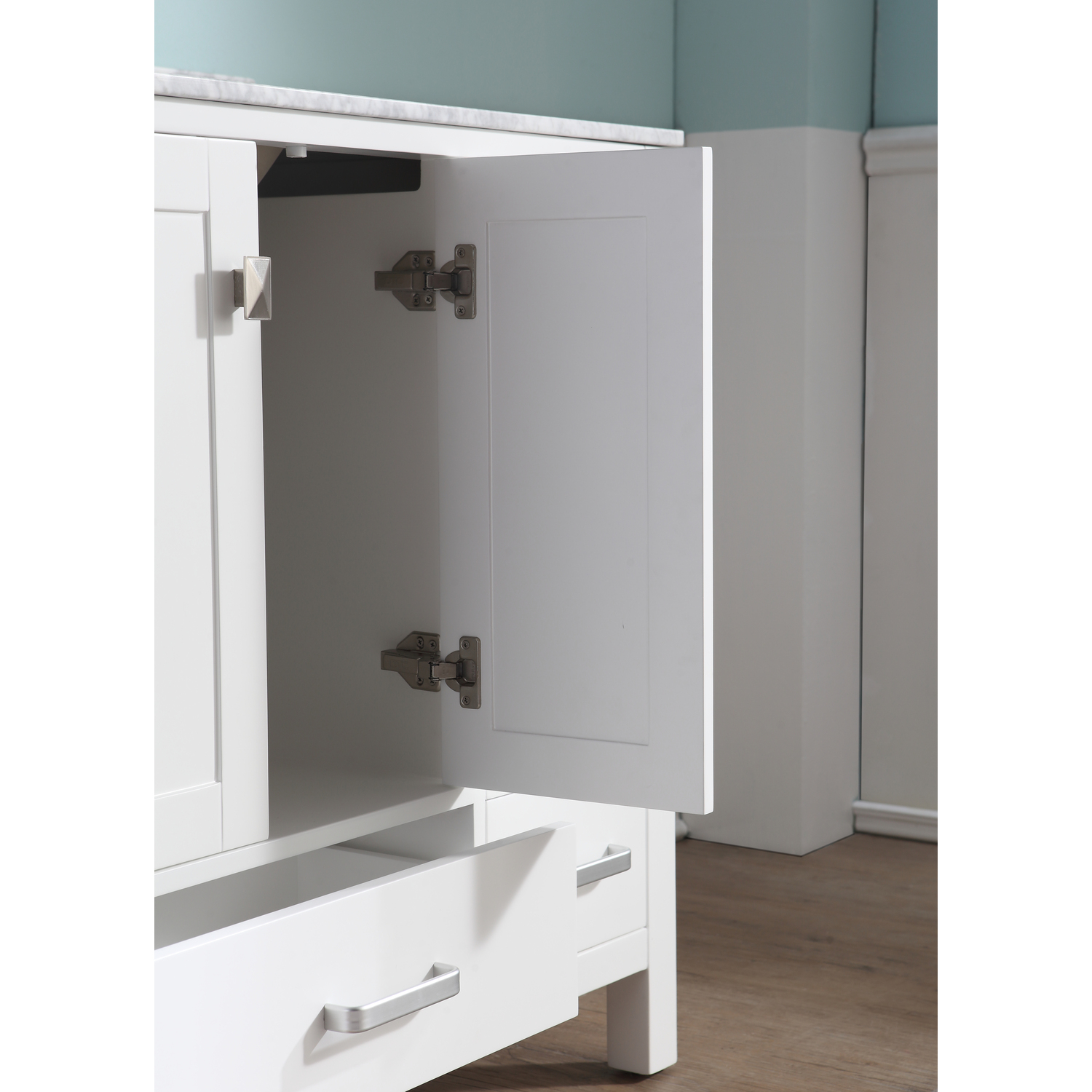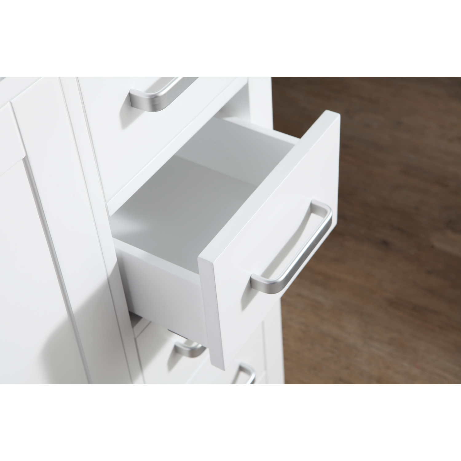 - Handmade wooden cabinet body in a rich white finish