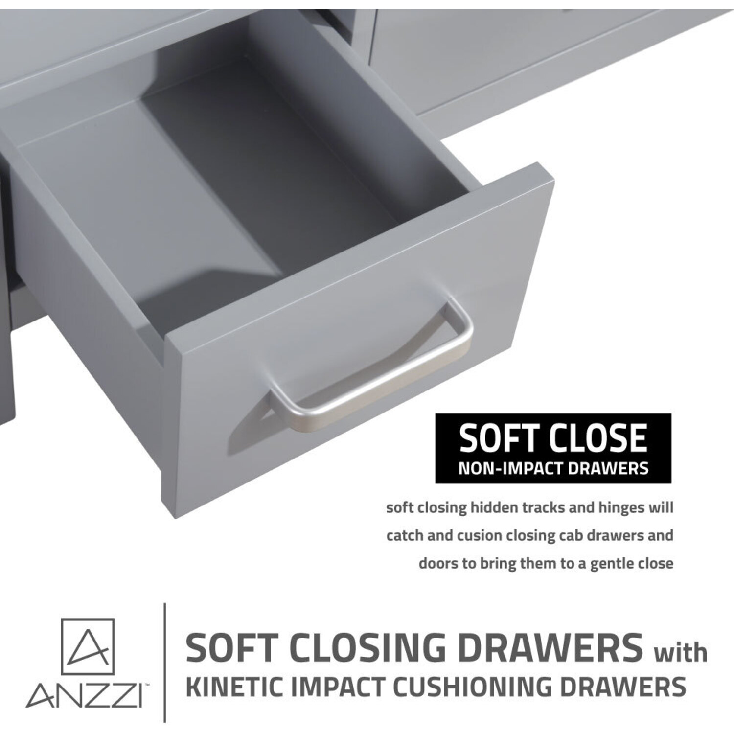 - ANZZI's kinetic cushioning protects your cabinets hardware and finish from slamming doors or drawers