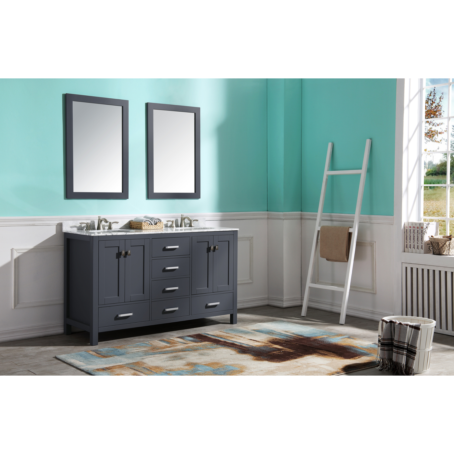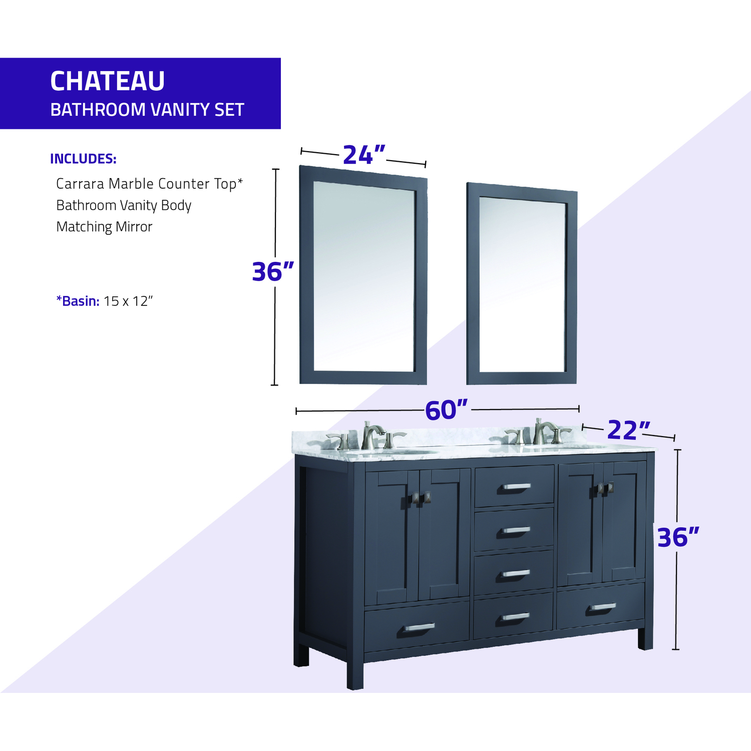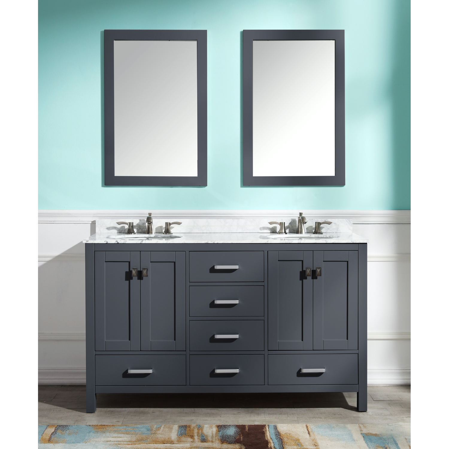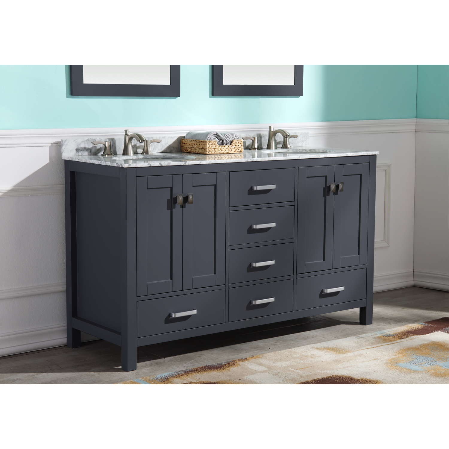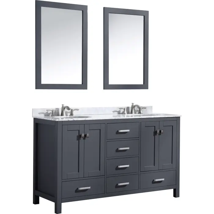 Included: Rich gray vanity body, Carrara White marble counter top, white ceramic basin sink, two (2) gray wall mounted mirrors, brushed and satin hardwareHandmade wooden cabinet body in a rich gray finishBrilliant brushed and satin finish hardwareLuxurious Carrara White marble counter topTwo (2) marine grade ceramic basin sinks in stunning white finish with built in overflow; drain assembly not includedMatching wall mounted silver glassed mirror offering crisply sharp reflectivenessANZZI Paladin Protection finish is an anti-scratch shielding that makes our wood finishes nigh impervious to scratches and scuffsRHINO ALLOY certified materialsANZZI's kinetic cushioning protects your cabinets hardware and finish from slamming doors or drawersSix (6) soft closing drawers with hidden tracksFour (4) soft closing cabinet doorsOverall Dimensions: 60 in. W x 22 in. D x 36 in. HMirror dimensions: 24 in. W x 36 in. HThree (3) pre-drilled holes for an 8 in. widespread faucet