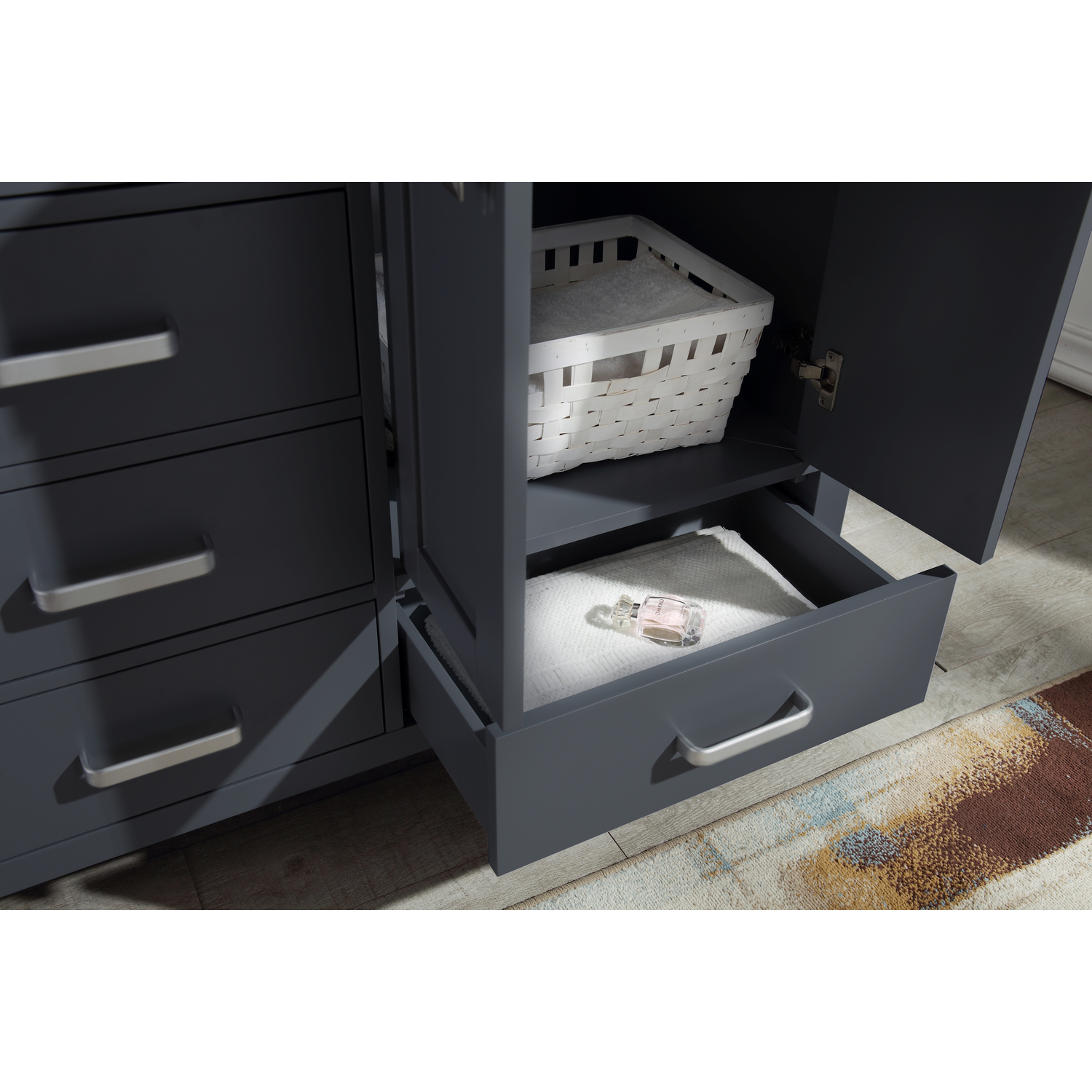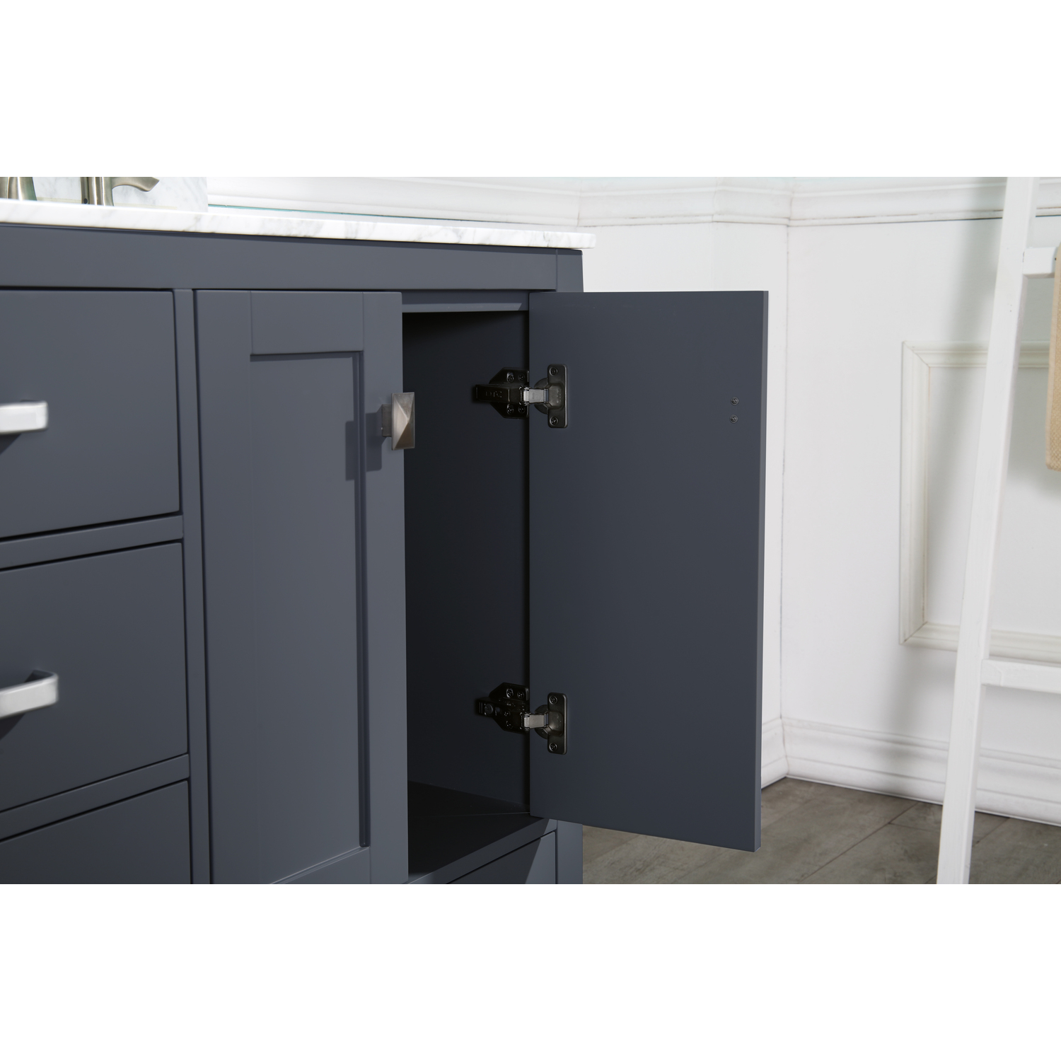 - Handmade wooden cabinet body in a rich gray finish