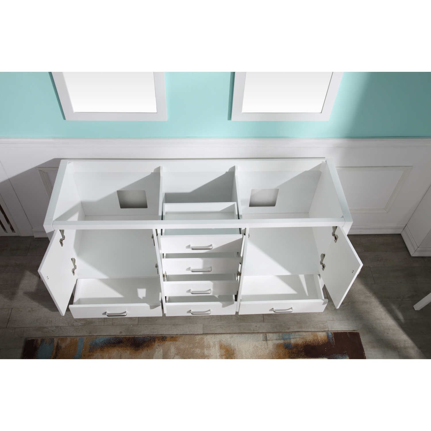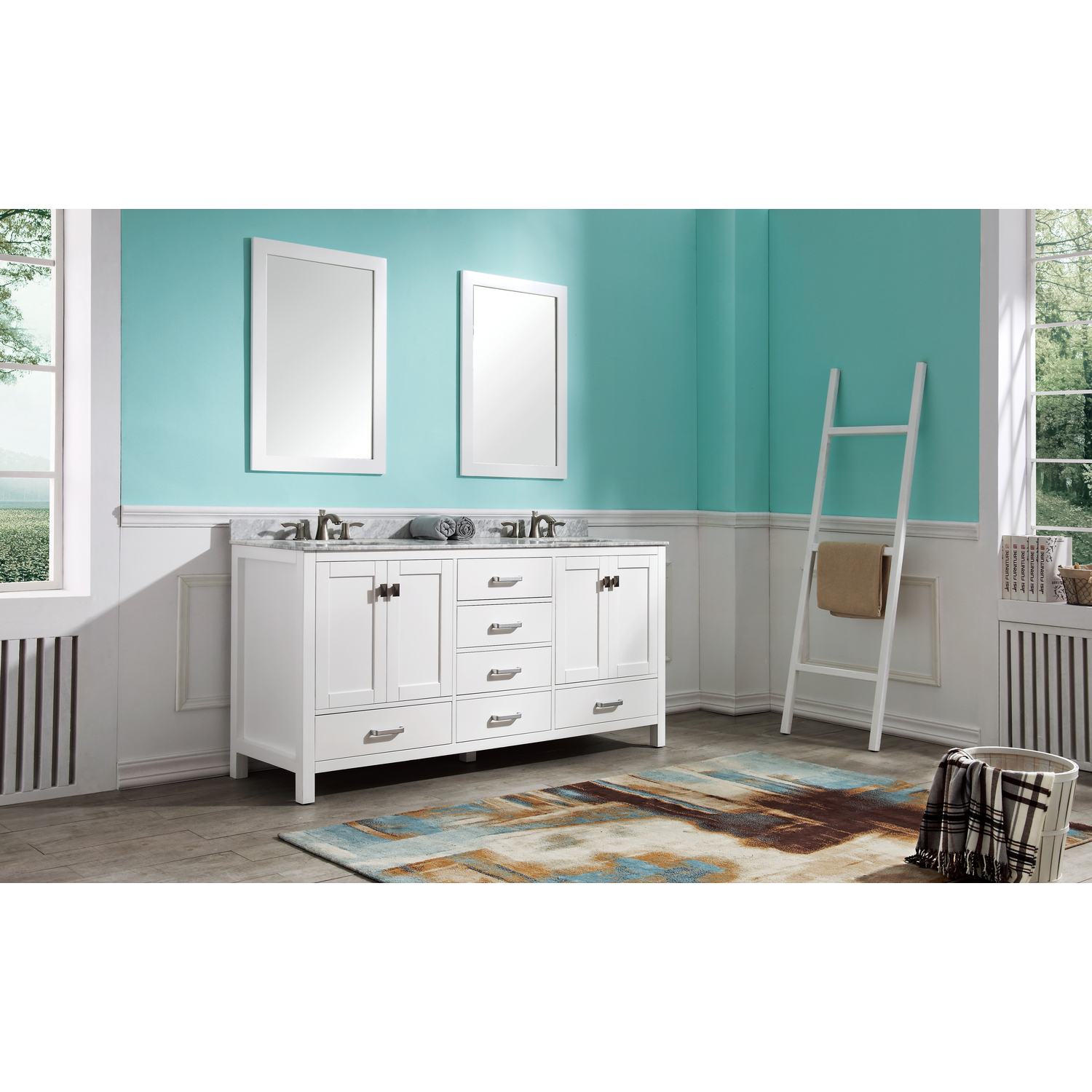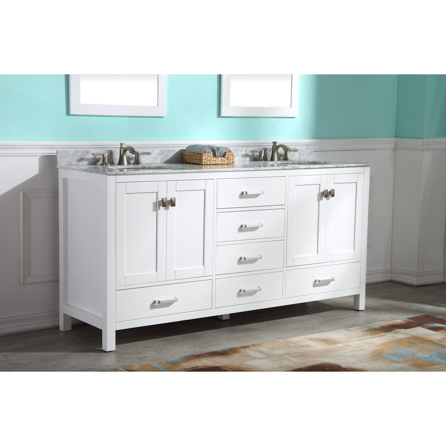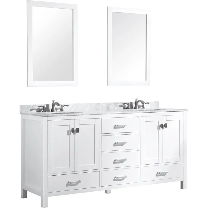 Included: Rich white vanity body, Carrara White marble counter top, white ceramic basin sink, two (2) white wall mounted mirrors, brushed and satin hardwareHandmade wooden cabinet body a rich white finishBrilliant brushed and satin finish hardwareLuxurious Carrara White marble counter topTwo (2) marine grade ceramic basin sink in stunning white finish with built in overflow; drain assembly not includedMatching wall mounted silver glassed mirror offering crisply sharp reflectivenessANZZI Paladin Protection finish is an anti-scratch shielding that makes our wood finishes nigh impervious to scratches and scuffsRHINO ALLOY certified materialsANZZI's kinetic cushioning protects your cabinets hardware and finish from slamming doors or drawersSix (6) soft closing drawers with hidden tracksFour (4) soft closing cabinet doorsOverall Dimensions: 72 in. W x 22 in. D x 36 in. HMirror dimensions: 24 in. W x 36 in. HThree (3) pre-drilled holes for an 8 in. widespread faucet