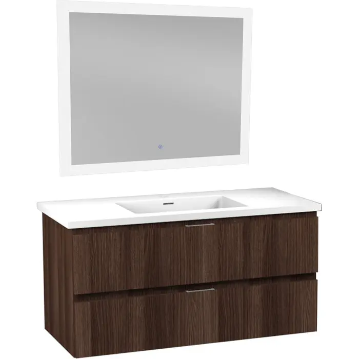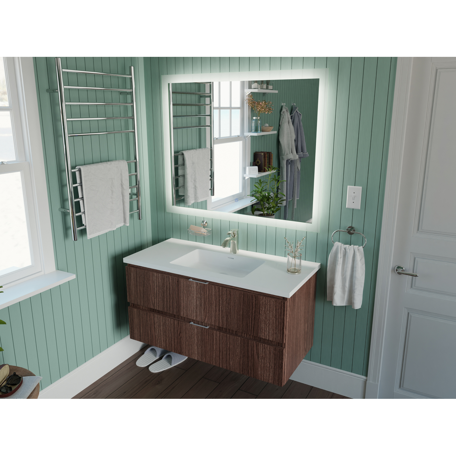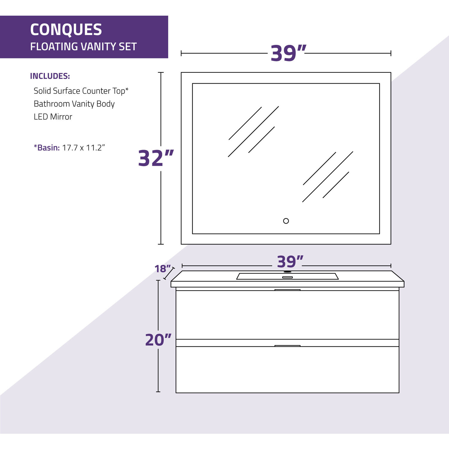 Set includes vanity with top and sink, LED mirror and mounting hardwareOverall dimensions: 39 in. W x 20 in. H x 18 in. DMirror dimensions: 39 in. W x 32 in. HBasin dimensions: 17.7 in. W x 11.2 in. L x 3.5 in. DSink and countertop are crafted from beautiful and durable solid surface man-made stone that’s finished in Glossy WhiteThe fog-free LED mirror is ETL certified for all North American Safety standardsEasy-to-use Touch Sense control lets you activate and adjust mirror lights and defogger with a simple press of a button3000K+6000K LED strip adjusts from warm yellow to cool white, so you can customize the light temperature to fit your mood and your bathroom spaceBuilt-in diffusers keep light output even and consistent, so it’s always comfortable for your eyesDefogger quickly eliminates condensation so mirror is clear when you’re done bathing or showeringSoft closing drawers are nearly impossible to slam — give them a push and they catch and gently closeVanity includes a removable insert tray that’s ideal for organizing and storing your personal care productsWall-mounted design is a stylish and modern alternative to traditional floor-mounted vanitiesComposite wood construction has a beautifully textured finish for a unique, premium look
