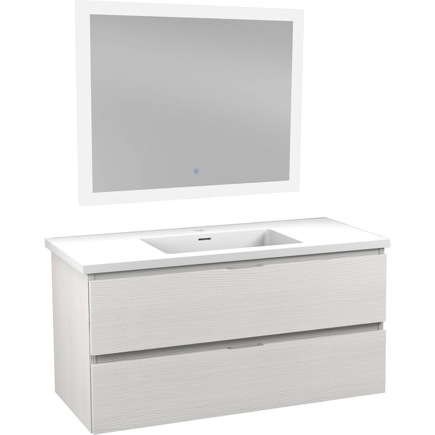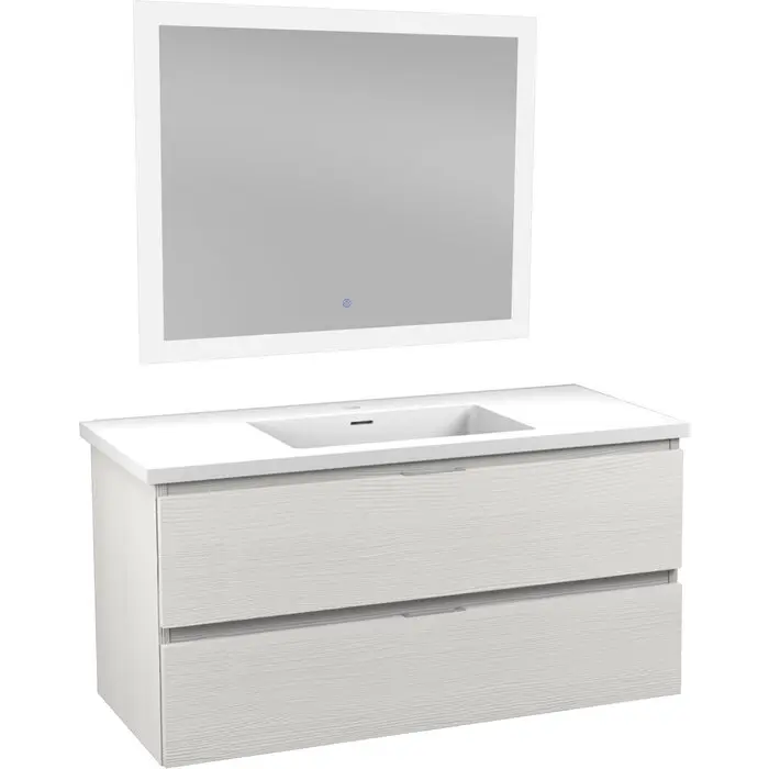 Set includes vanity with top and sink, LED mirror and mounting hardwareOverall dimensions: 39 in. W x 20 in. H x 18 in. DMirror dimensions: 39 in. W x 32 in. HBasin dimensions: 17.7 in. W x 11.2 in. L x 3.5 in. DSink and countertop are crafted from beautiful and durable solid surface man-made stone that’s finished in Glossy WhiteThe fog-free LED mirror is ETL certified for all North American Safety standardsEasy-to-use Touch Sense control lets you activate and adjust mirror lights and defogger with a simple press of a button3000K+6000K LED strip adjusts from warm yellow to cool white, so you can customize the light temperature to fit your mood and your bathroom spaceBuilt-in diffusers keep light output even and consistent, so it’s always comfortable for your eyesDefogger quickly eliminates condensation so mirror is clear when you’re done bathing or showeringSoft closing drawers are nearly impossible to slam — give them a push and they catch and gently closeVanity includes a removable insert tray that’s ideal for organizing and storing your personal care productsWall-mounted design is a stylish and modern alternative to traditional floor-mounted vanitiesComposite wood construction has a beautifully textured finish for a unique, premium look