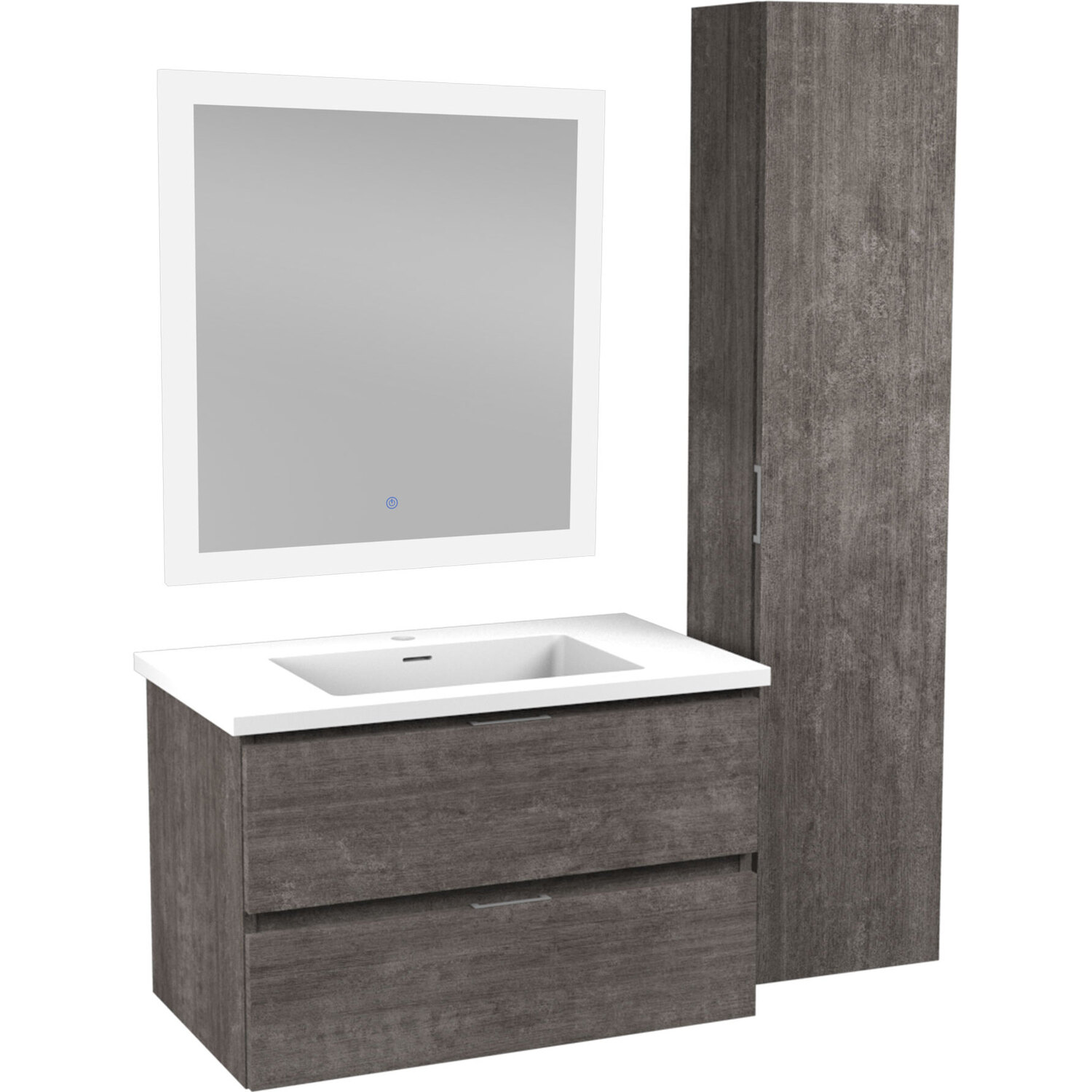 Set includes vanity with top and sink, side cabinet, LED mirror and mounting hardwareOverall dimensions: 30 in. W x 20 in. H x 18 in. DMirror dimensions: 30 in. W x 32 in. HSide cabinet dimensions: 12 in. W x 55 in. H x 9 in. DBasin dimensions: 17.7 in. W x 11.2 in. L x 3.5 in. DSink and countertop are crafted from beautiful and durable solid surface man-made stone that’s finished in Glossy WhiteThe fog-free LED mirror is ETL certified for all North American Safety standardsEasy-to-use Touch Sense control lets you activate and adjust mirror lights and defogger with a simple press of a button3000K+6000K LED strip adjusts from warm yellow to cool white, so you can customize the light temperature to fit your mood and your bathroom spaceBuilt-in diffusers keep light output even and consistent, so it’s always comfortable for your eyesDefogger quickly eliminates condensation so mirror is clear when you’re done bathing or showeringSoft closing doors and drawers are nearly impossible to slam — give them a push and they catch and gently closeVanity includes a removable insert tray that’s ideal for organizing and storing your personal care productsWall-mounted design is a stylish and modern alternative to traditional floor-mounted vanities