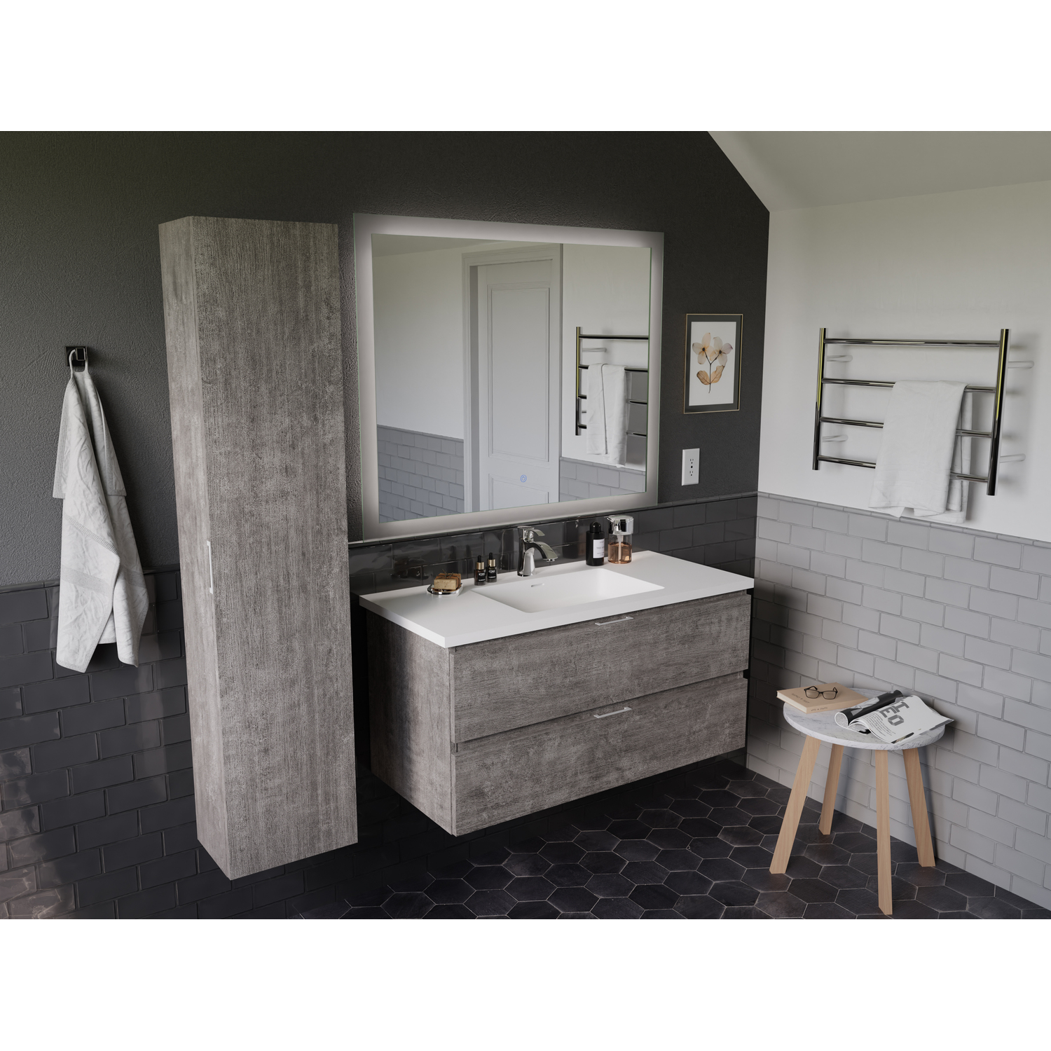 Set includes vanity with top and sink, side cabinet, LED mirror and mounting hardwareOverall dimensions: 39 in. W x 20 in. H x 18 in. DMirror dimensions: 39 in. W x 32 in. HSide cabinet dimensions: 12 in. W x 55 in. H x 9 in. DBasin dimensions: 17.7 in. W x 11.2 in. L x 3.5 in. DSink and countertop are crafted from beautiful and durable solid surface man-made stone that’s finished in Glossy WhiteThe fog-free LED mirror is ETL certified for all North American Safety standardsEasy-to-use Touch Sense control lets you activate and adjust mirror lights and defogger with a simple press of a button3000K+6000K LED strip adjusts from warm yellow to cool white, so you can customize the light temperature to fit your mood and your bathroom spaceBuilt-in diffusers keep light output even and consistent, so it’s always comfortable for your eyesDefogger quickly eliminates condensation so mirror is clear when you’re done bathing or showeringSoft closing doors and drawers are nearly impossible to slam — give them a push and they catch and gently closeVanity includes a removable insert tray that’s ideal for organizing and storing your personal care productsWall-mounted design is a stylish and modern alternative to traditional floor-mounted vanities