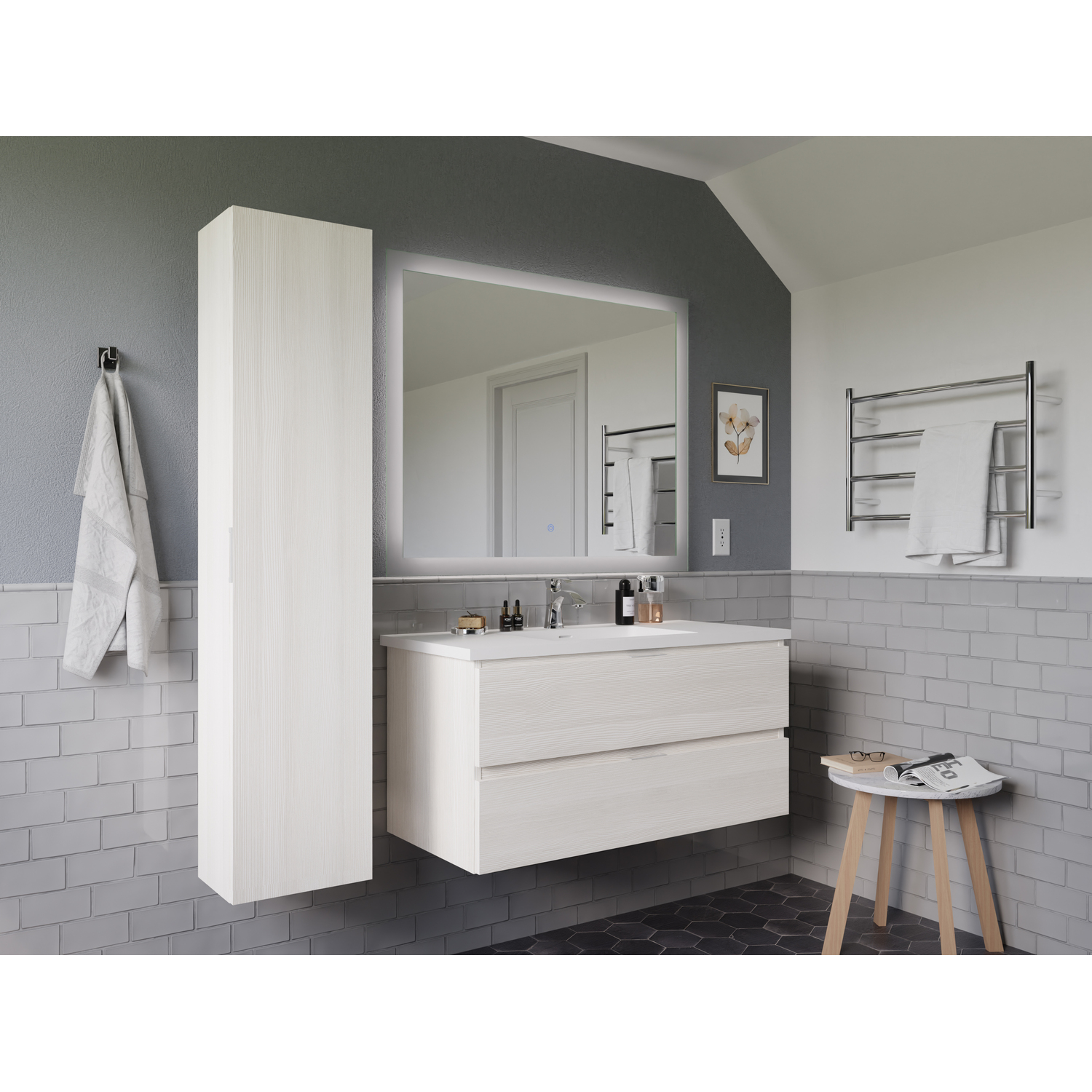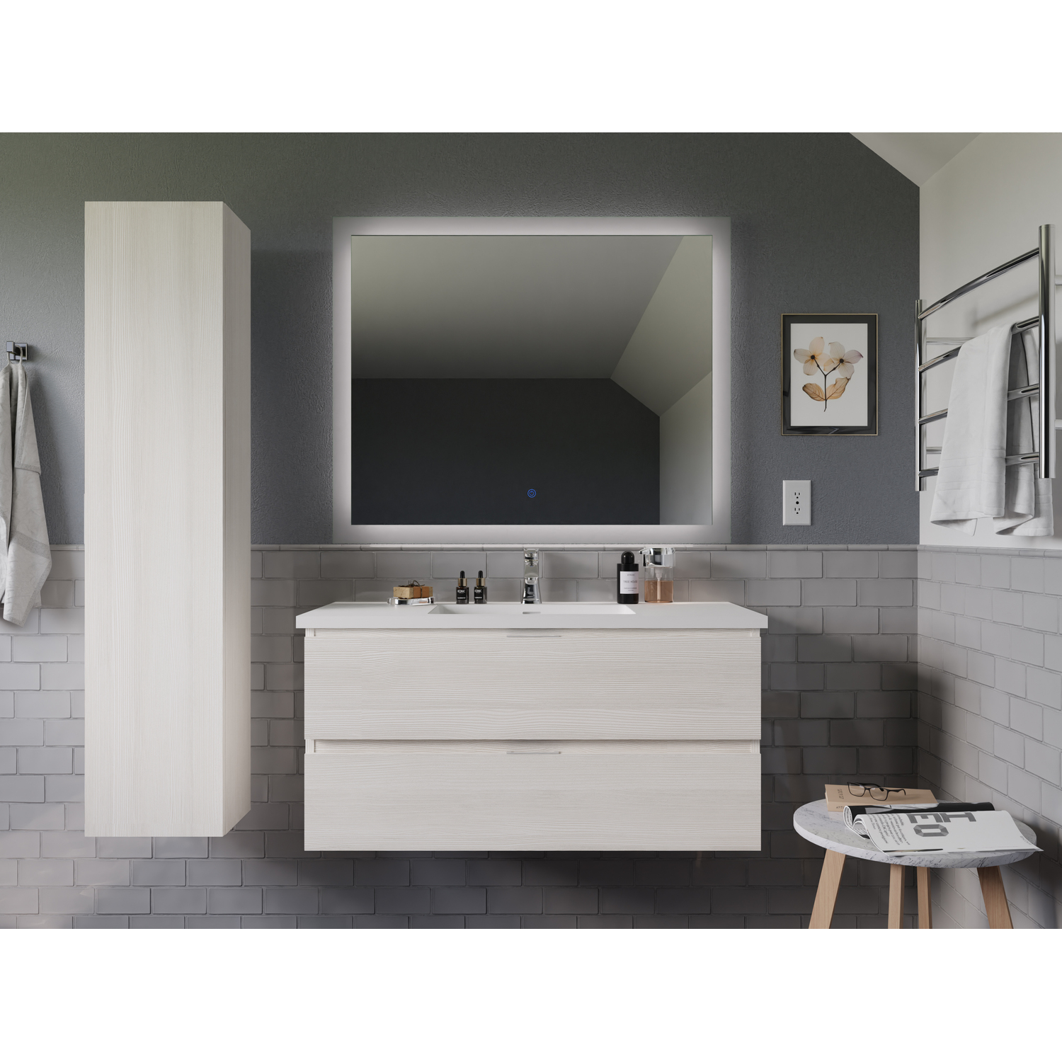 This smart-looking set asserts its individuality with a clever combination of style and function. The vanity features two spacious drawers that are perfect for storing and organizing personal care items. It’s topped with a man-made stone counter and sink finished in a gorgeous Glossy White. The side cabinet makes a great place to store towels and linens in one convenient location. The LED mirror features adjustable light temperatures and a built-in defogger that clears condensation from its surface.