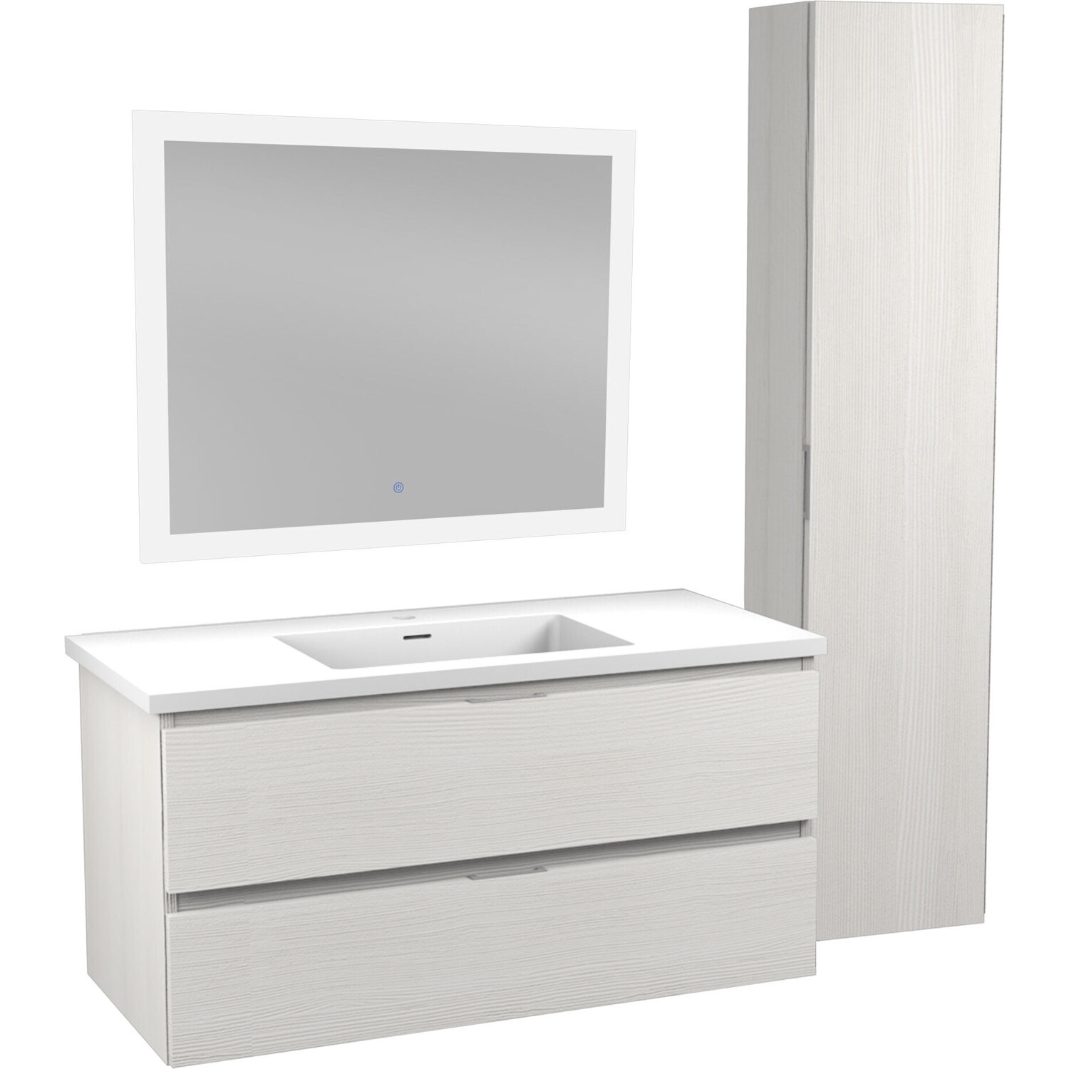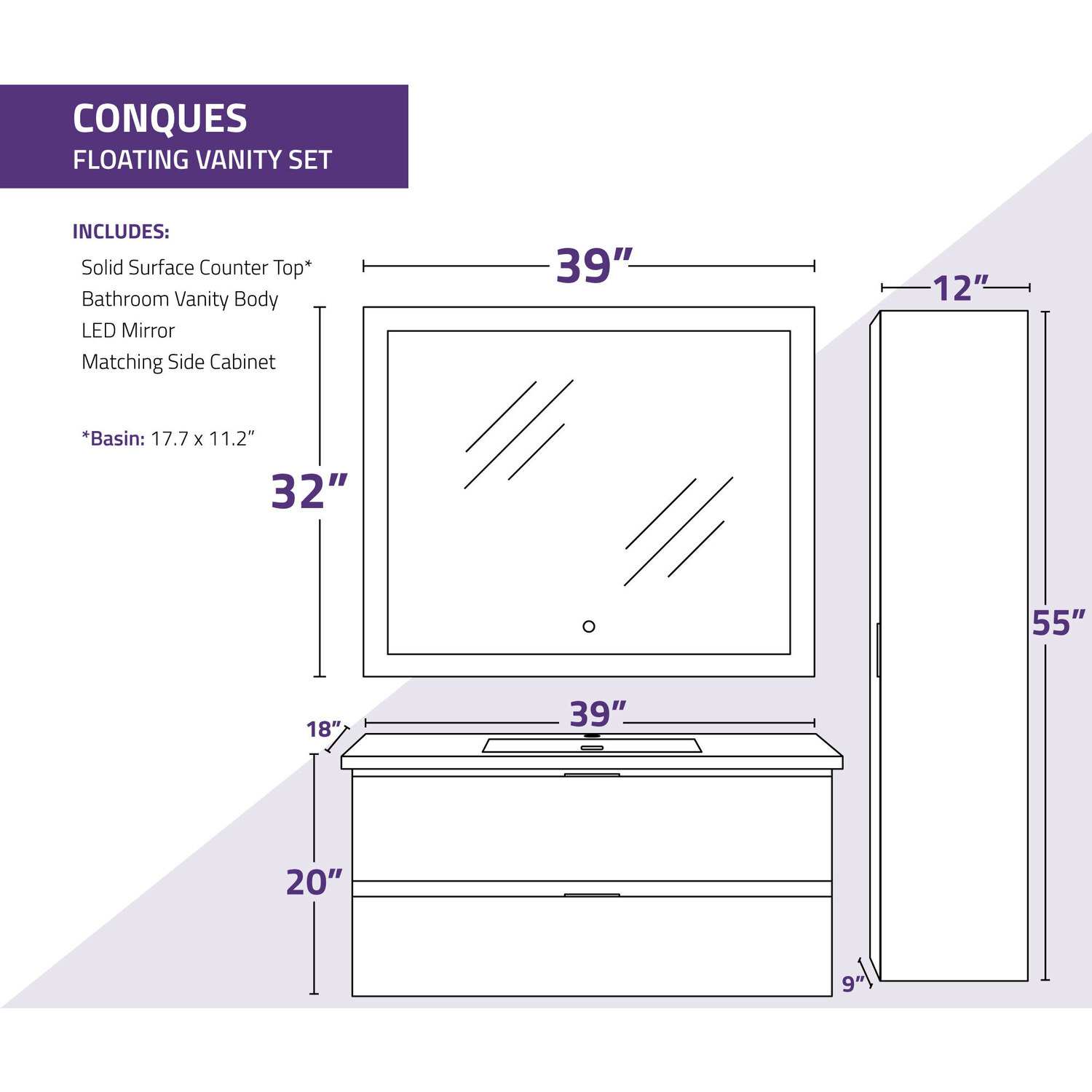 Set includes vanity with top and sink, side cabinet, LED mirror and mounting hardwareOverall dimensions: 39 in. W x 20 in. H x 18 in. DMirror dimensions: 39 in. W x 32 in. HSide cabinet dimensions: 12 in. W x 55 in. H x 9 in. DBasin dimensions: 17.7 in. W x 11.2 in. L x 3.5 in. DSink and countertop are crafted from beautiful and durable solid surface man-made stone that’s finished in Glossy WhiteThe fog-free LED mirror is ETL certified for all North American Safety standardsEasy-to-use Touch Sense control lets you activate and adjust mirror lights and defogger with a simple press of a button3000K+6000K LED strip adjusts from warm yellow to cool white, so you can customize the light temperature to fit your mood and your bathroom spaceBuilt-in diffusers keep light output even and consistent, so it’s always comfortable for your eyesDefogger quickly eliminates condensation so mirror is clear when you’re done bathing or showeringSoft closing doors and drawers are nearly impossible to slam — give them a push and they catch and gently closeVanity includes a removable insert tray that’s ideal for organizing and storing your personal care productsWall-mounted design is a stylish and modern alternative to traditional floor-mounted vanities