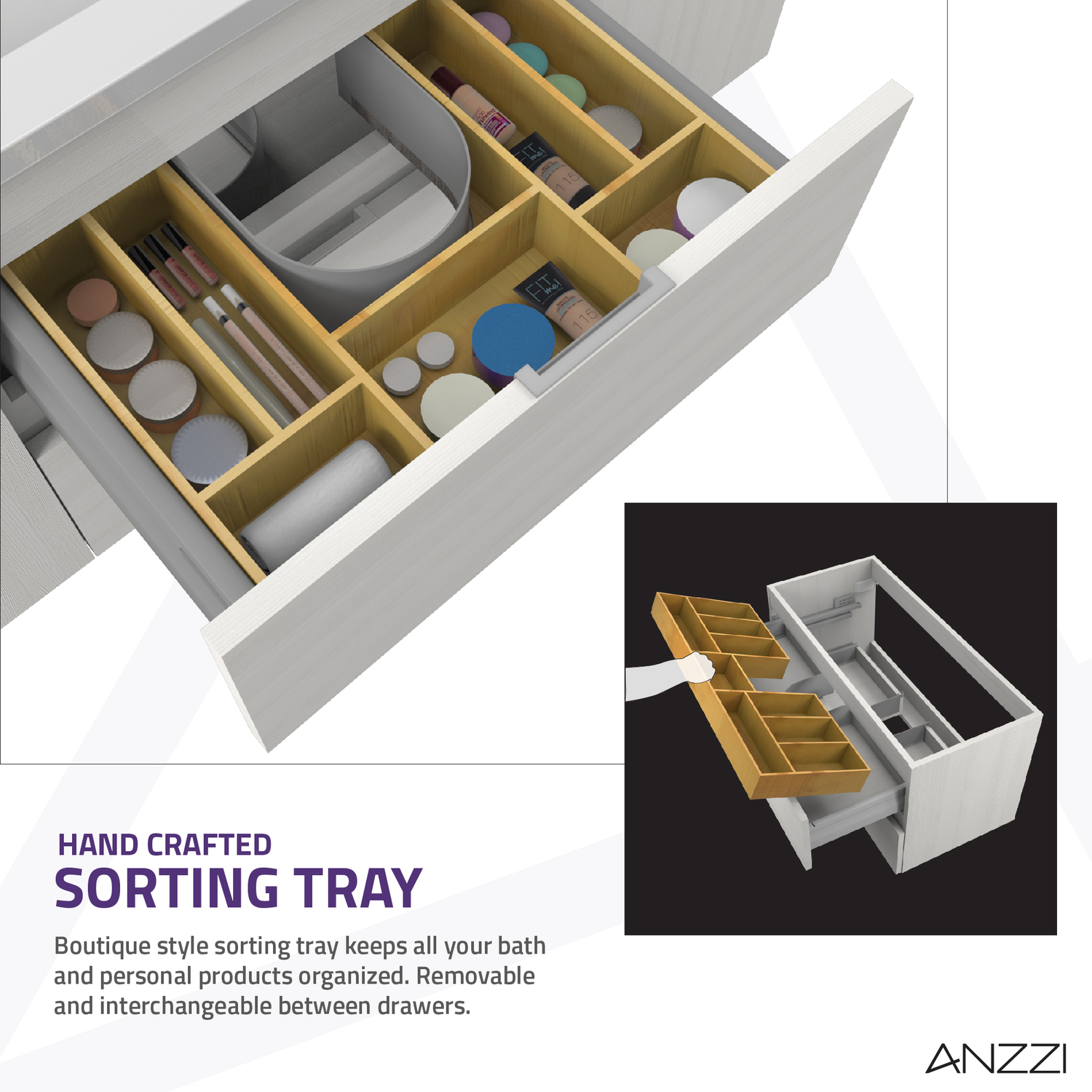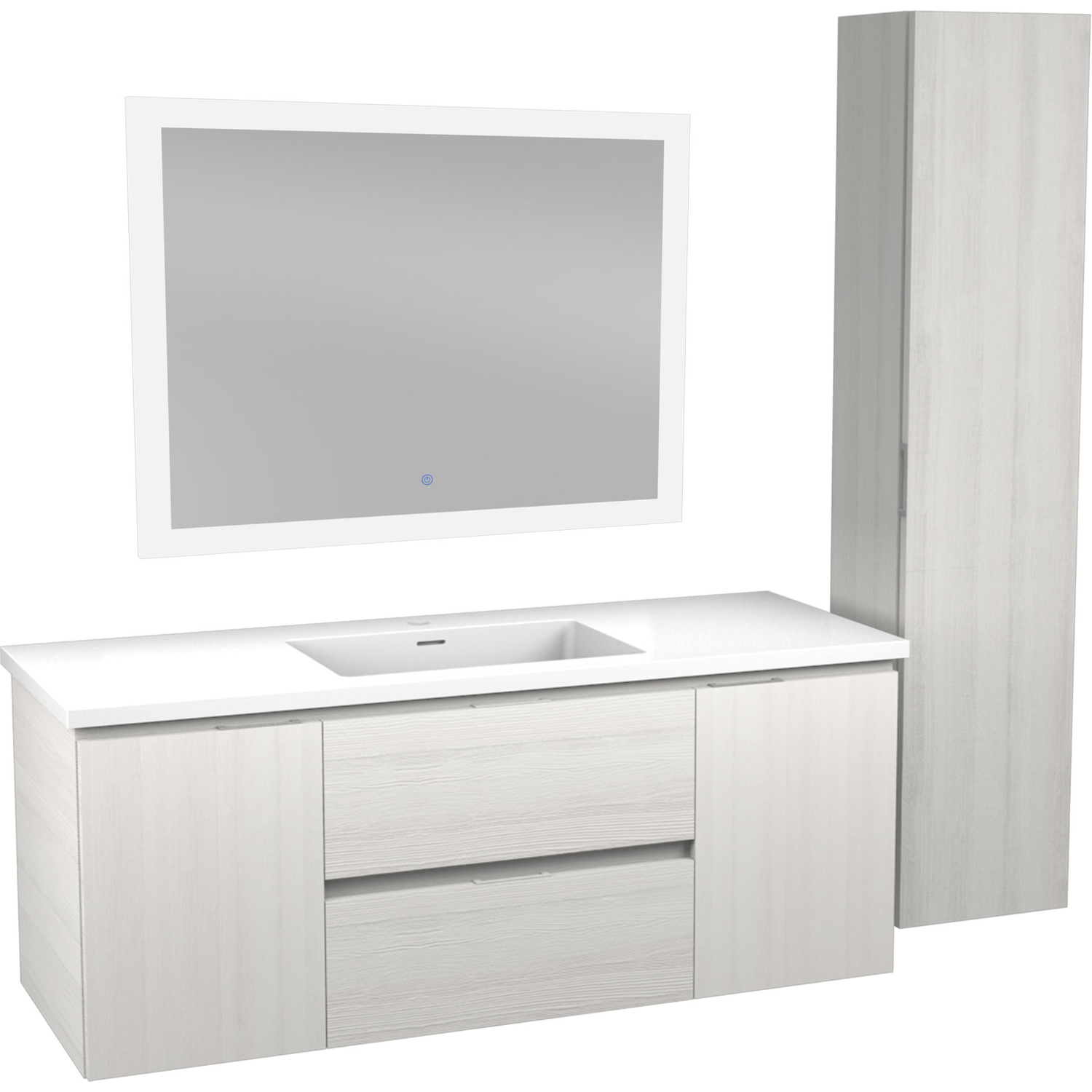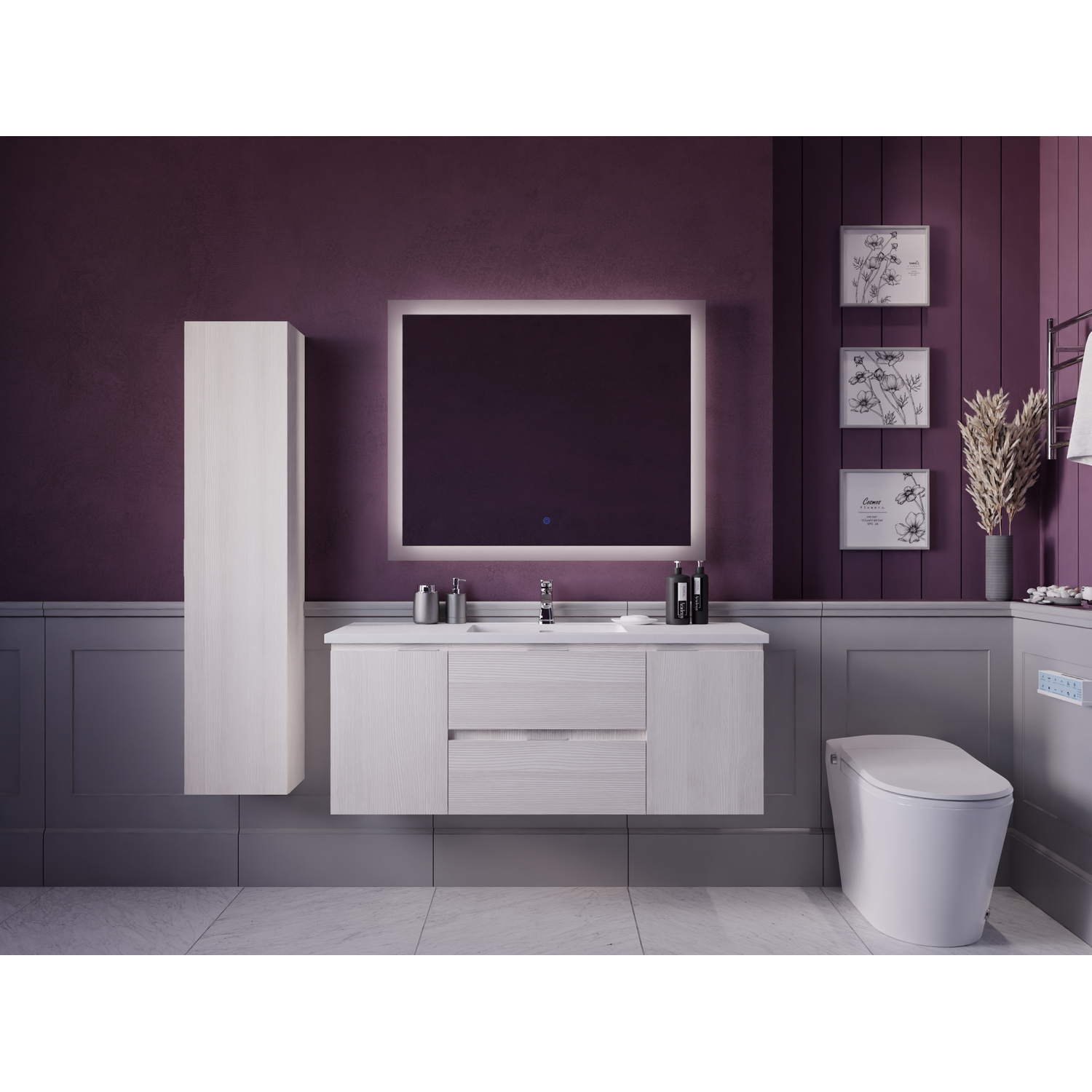 Set includes vanity with top and sink, side cabinet, LED mirror and mounting hardwareOverall dimensions: 48 in. W x 20 in. H x 18 in. DMirror dimensions: 39 in. W x 32 in. HSide cabinet dimensions: 12 in. W x 55 in. H x 9 in. DBasin dimensions: 17.7 in. W x 11.2 in. L x 3.5 in. DSink and countertop are crafted from beautiful and durable solid surface man-made stone that’s finished in Glossy WhiteThe fog-free LED mirror is ETL certified for all North American Safety standardsEasy-to-use Touch Sense control lets you activate and adjust mirror lights and defogger with a simple press of a button3000K+6000K LED strip adjusts from warm yellow to cool white, so you can customize the light temperature to fit your mood and your bathroom spaceBuilt-in diffusers keep light output even and consistent, so it’s always comfortable for your eyesDefogger quickly eliminates condensation so mirror is clear when you’re done bathing or showeringSoft closing doors and drawers are nearly impossible to slam — give them a push and they catch and gently closeVanity includes a removable insert tray that’s ideal for organizing and storing your personal care productsWall-mounted design is a stylish and modern alternative to traditional floor-mounted vanities