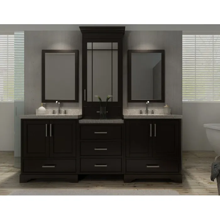 Make bathroom storage look glamorous with the Stafford vanity set series from Ariel Bath. The Stafford series includes light granite countertops mounted above espresso colored cabinets finished with satin nickel finish hardware. The matching framed mirrors accompanying this series round out the contemporary design for a completed look.