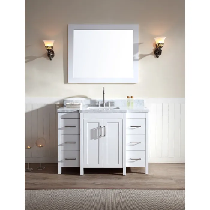 A modern bathroom remodel is incomplete without a stylish bathroom vanity set. The Hollandale series from Ariel Bath features solid wood cabinets with carrara white marble countertops. The dovetail drawers are soft-closing and the satin nickel finish hardware rounds out this beautiful design.