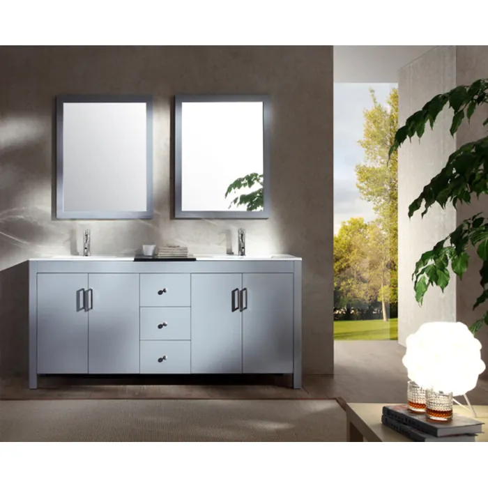 The Ariel Bath Hanson series offers beauty and elegance in a contemporary design for the modern home bathroom. The grey colored cabinets are solid wood and the doors and drawers are soft-closing. Furthermore, the satin nickel finish hardware and the two matching mirrors are included with this vanity set.