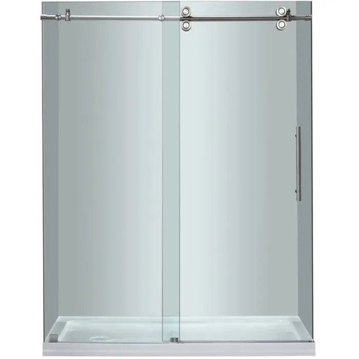 Create a new contemporary look for your bathroom with the Aston Langham 60 in. x 77.5 in. Completely Frameless Sliding Shower Door. Accentuated with either chrome or brushed stainless steel finish on stainless steel constructed hardware, thick premium 3/8 in. (10mm) ANSI certified frosted tempered glass and deluxe full-length seal strips to prevent leakage; this European-inspired, luxurious door instantly creates a sophisticated custom-look style for your bath at a fraction of the cost. Perfect for that larger alcove space in your bathroom. All installation hardware is included. This model is engineered for both right and left handed door installation, and includes a 2.5" low profile fiberglass-enforced acrylic base, right drain configuration.