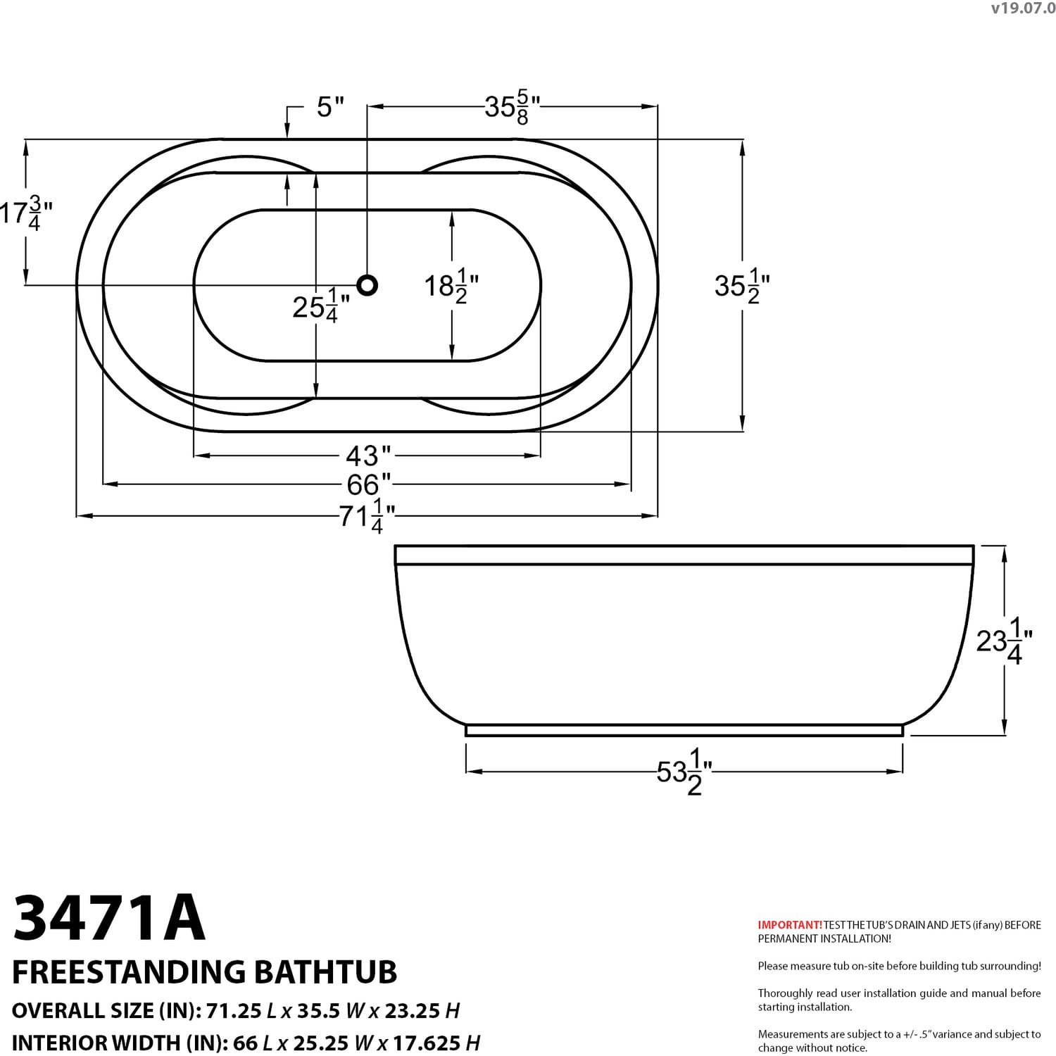 Embrace freestanding series features contemporary elliptical design, increasing the inner length of the bathtub. Slight side inset of the side edge adds a sense of modern design, which will compliment bath and sauna rooms of various settings and styles. Creates an elegant, functional centerpiece for your bathroom and the focal point for relaxation. Aesthetically appealing and physically soothing merging both worlds into a triumph of elegance.Give us a call at 1-866-588-8008 if you have any questions or just need help selecting the right tub for your needsSOAKING BATHTUB - Non-jetted deep soaking bathtub that’s easy to install. No need to run electrical wiring.Marine grade acrylic with fiberglass reinforcement offers a smooth long lasting shine with superior durabilitySmooth, glossy ultra white acrylic finishCenter drain locationOverall dimensions: 71.25" L x 35.5" W x 23.25" HBasin dimensions: 66" L x 25.25" WAverage water capacity: 53 gallons10 YEAR WARRANTY - Bathtub shell is protected with a limited 10 year warranty against manufacturer defects; 1 year for parts replacement; 90 days for laborCurbside delivery only. The carrier will only unload the bathtub off the truck and is not responsible for carrying package inside home.IAPMO Listed10 year warranty on bathtub shell; 1 year warranty on parts; Lifetime warranty on door seal
