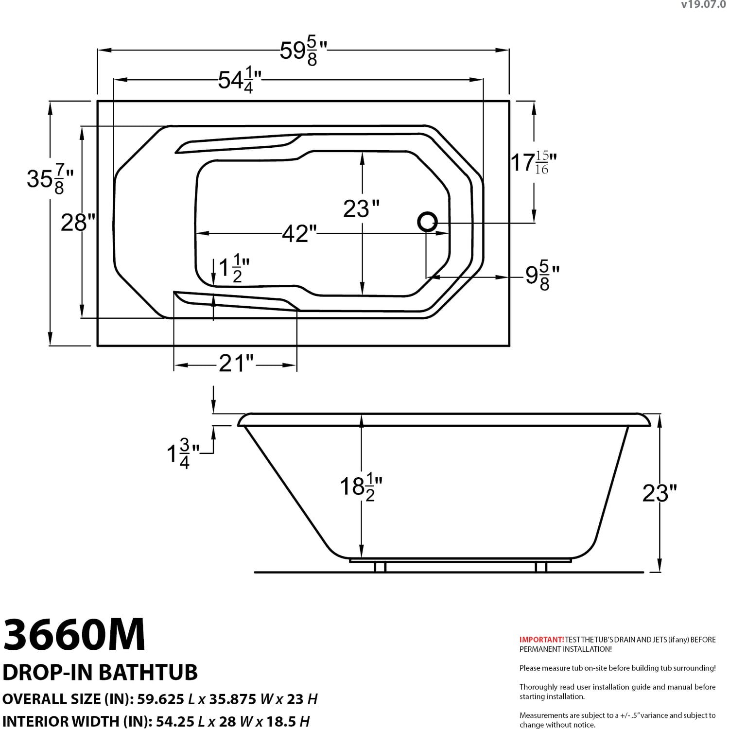 Mirage bathtubs feature a compact rectangular design with an oval opening. Molded arm and back rests provide exceptional comfort, while aiding in safety. Creates an elegant, functional centerpiece for your bathroom and the focal point for relaxation. Aesthetically appealing and physically soothing merging both worlds into a triumph of elegance.Give us a call at 1-866-588-8008 if you have any questions or just need help selecting the right tub for your needsSOAKING BATHTUB - Non-jetted deep soaking bathtub that’s easy to install. No need to run electrical wiring.Marine grade acrylic with fiberglass reinforcement offers a smooth long lasting shine with superior durabilitySmooth, glossy ultra white acrylic finishCenter drain locationOverall dimensions: 59.625" L x 35.875" W x 23" HBasin dimensions: 54.25" L x 28" WAverage water capacity: 50 gallons10 YEAR WARRANTY - Bathtub shell is protected with a limited 10 year warranty against manufacturer defects; 1 year for parts replacement; 90 days for laborCurbside delivery only. The carrier will only unload the bathtub off the truck and is not responsible for carrying package inside home.IAPMO Listed10 year warranty on bathtub shell; 1 year warranty on parts; Lifetime warranty on door seal