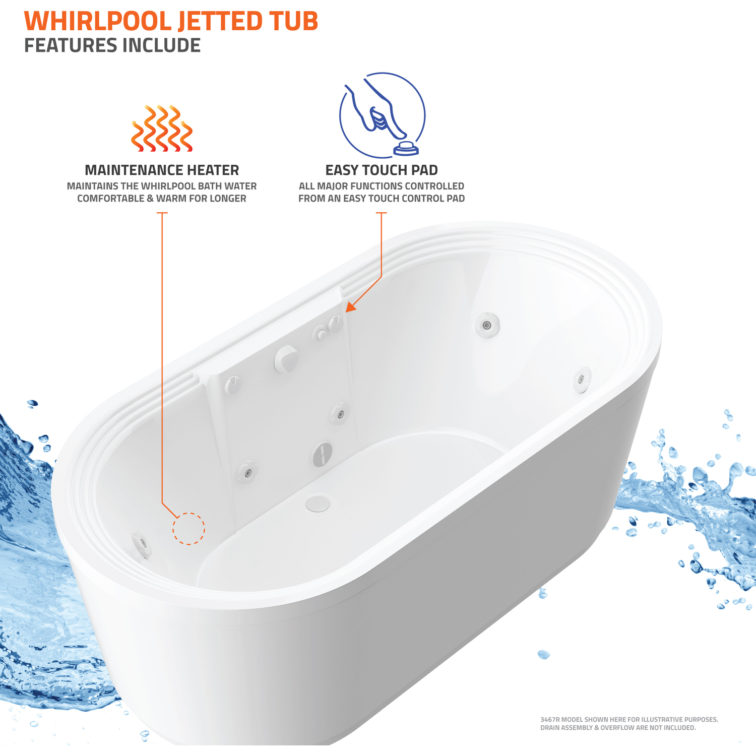 Breeze freestanding bathtub series design resembles the water droplet resonance phenomena. The sloped inner edge of the bathtub functions as two comfortable inclining armrests. Creates an elegant, functional centerpiece for your bathroom and the focal point for relaxation. Aesthetically appealing and physically soothing merging both worlds into a triumph of elegance.WHIRLPOOL JETTED - 8 adjustable & directional hydro-therapeutic whirlpool massage jetsMAINTENANCE HEATER - Maintains warm and comfortable bathing temperatureRaised easy-push buttons and whirlpool pressure controlsMarine grade acrylic with fiberglass reinforcement offers a smooth long lasting shine with superior durabilitySmooth, glossy ultra white acrylic finish with matching trimOverall dimensions: 71.5" L x 38.75" W x 23.625" HBasin dimensions: 55.5" L x 27" WAverage water capacity: 54 gallonsReversible drain locationIAPMO Listed10 YEAR WARRANTY - Bathtub shell is protected with a limited 10 year warranty against manufacturer defects; 1 year for parts replacement; 90 days for laborCurbside delivery only. The carrier will only unload the bathtub off the truck and is not responsible for carrying package inside home.