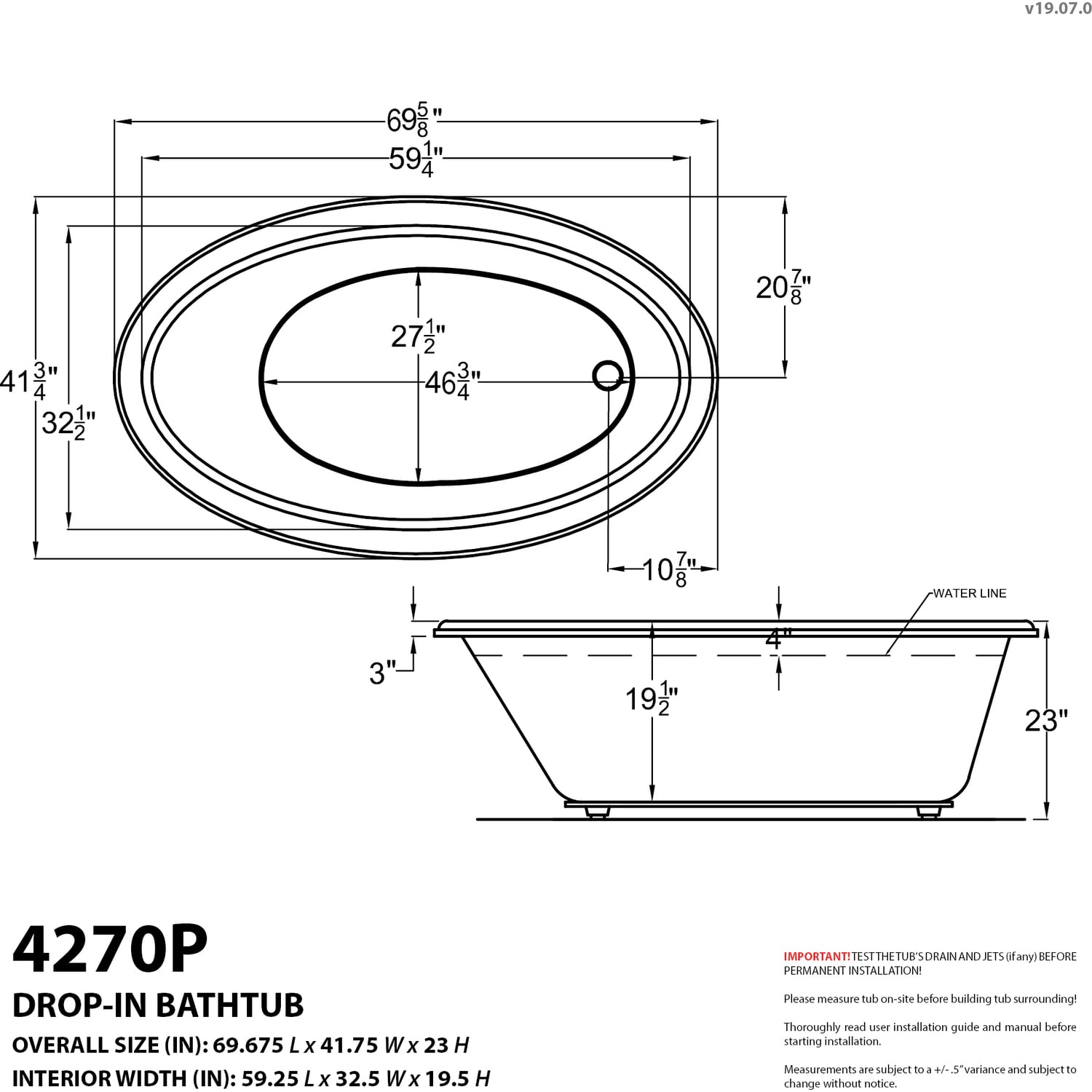 Petite series features a classic oval-shaped bathtub design with stylish, ridged edges. The oval bathtub opening allows bathers to enjoy a comfortable bathing experience. Creates an elegant, functional centerpiece for your bathroom and the focal point for relaxation. Aesthetically appealing and physically soothing merging both worlds into a triumph of elegance.Give us a call at 1-866-588-8008 if you have any questions or just need help selecting the right tub for your needsSOAKING BATHTUB - Non-jetted deep soaking bathtub that’s easy to install. No need to run electrical wiring.Marine grade acrylic with fiberglass reinforcement offers a smooth long lasting shine with superior durabilitySmooth, glossy ultra white acrylic finishReversible drain locationOverall dimensions: 69.675" L x 41.75" W x 23" HBasin dimensions: 59.25" L x 32.5" WAverage water capacity: 50 gallons10 YEAR WARRANTY - Bathtub shell is protected with a limited 10 year warranty against manufacturer defects; 1 year for parts replacement; 90 days for laborCurbside delivery only. The carrier will only unload the bathtub off the truck and is not responsible for carrying package inside home.IAPMO Listed10 year warranty on bathtub shell; 1 year warranty on parts; Lifetime warranty on door seal